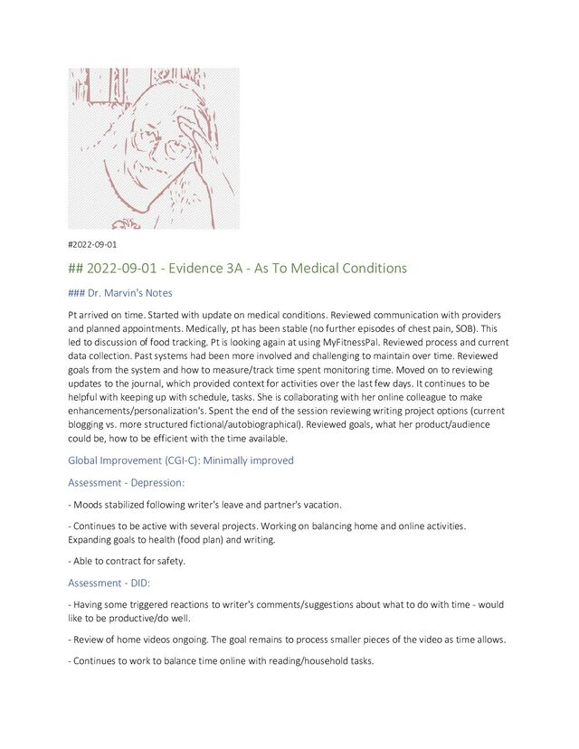 Pt arrived on time. Reports that she was busy today working on Guilded material. Reviewed Party Quests (online group to help with accountability). Reviewed goals she has planned out. Explored options for operationalizing her goal summary so that the counting doesn't become a burden. Moved on to video of her son. He had a semi-famous poker player over to his house and they posted a video. Reviewed excepts and discussed experience. Overall, it was a very exciting event for everyone. Moved on to discussion of online friend N. Reviewed updates and how interactions have progressed. Pt feels that they are adjusting to a new routine. Pt feels she still can make more progress on her schedule. Feels that she is watching more TV (news) than she would like. Did make progress on laundry but hasn't kept up with dishes. Reviewed goal setting. Reviewed medical updates. Pt had tripped and fell yesterday getting up from her chair. Feeling sore today. No loss of consciousness. Reviewed use of Tylenol for pain control. She had been taking 5200mg daily. Reviewed total daily dose and options for lowering the dose while still maintaining adequate pain control. She and N worked out a plan that she agreed to. Reinforced daily limit of 3000mg. Conversation was difficult - does not want to have pain return/worsen. Also reviewed supplements she had purchased based on data from MyFitnessPal (components that were low). Writer assisted with comparing data with lab results and found that these supplements did not seem necessary. Ended session with update on son's wedding. Some part(s) are not feeling good about getting out for event. Reviewed/validated concerns. Challenged view of all negative vs. Balanced outcomes. Explored options to assist with concerns and plan for positive experiences. Agreed to check in next session about wedding plans.