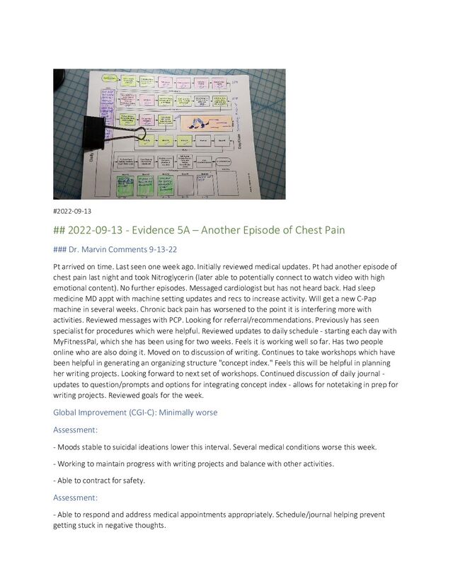 Pt arrived on time. Last seen one week ago. Initially reviewed medical updates. Pt had another episode of chest pain last night and took Nitroglycerin (later able to potentially connect to watch video with high emotional content). No further episodes. Messaged cardiologist but has not heard back. Had sleep medicine MD appt with machine setting updates and recs to increase activity. Will get a new C-Pap machine in several weeks. Chronic back pain has worsened to the point it is interfering more with activities. Reviewed messages with PCP. Looking for referral/recommendations. Previously has seen specialist for procedures which were helpful. Reviewed updates to daily schedule - starting each day with MyFitnessPal, which she has been using for two weeks. Feels it is working well so far. Has two people online who are also doing it. Moved on to discussion of writing. Continues to take workshops which have been helpful in generating an organizing structure "concept index." Feels this will be helpful in planning her writing projects. Looking forward to next set of workshops. Continued discussion of daily journal - updates to question/prompts and options for integrating concept index - allows for notetaking in prep for writing projects. Reviewed goals for the week.