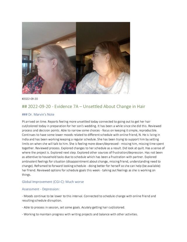 Pt arrived on time. Ongoing mixed to low feelings over the last two days. Had hair cut/colored on Tues. Reviewed details. Feels it went OK overall. She had taken the outline of goals and some pictures she liked. Next day was uncertain to disappointed with the results. Today is feeling better about it. Reports having a friendly conversation with N (back to previous level of discussion). Validated process and experience. This interaction led pt to feel empowered to get back to writing. Reviewed writing updates - daily journal leading to a summary of questions on multiplicity, next steps. Reviewed updates with interactions with partner. They are communicating more directly. Pt explained more about her moods affecting her household tasks. He was understanding and gave her positive feedback for doing more yesterday. Moved on to food/exercise updates. Continues to use MyFitnessPal and recently purchased an under-desk cycle. Has been using it daily. Explored short-term goals. Continued discussion on progression of depressive thoughts/low motivation for household tasks. Did better yesterday with dishes. Would like to get to some laundry today. Reviewed options for other activities to round out her schedule.