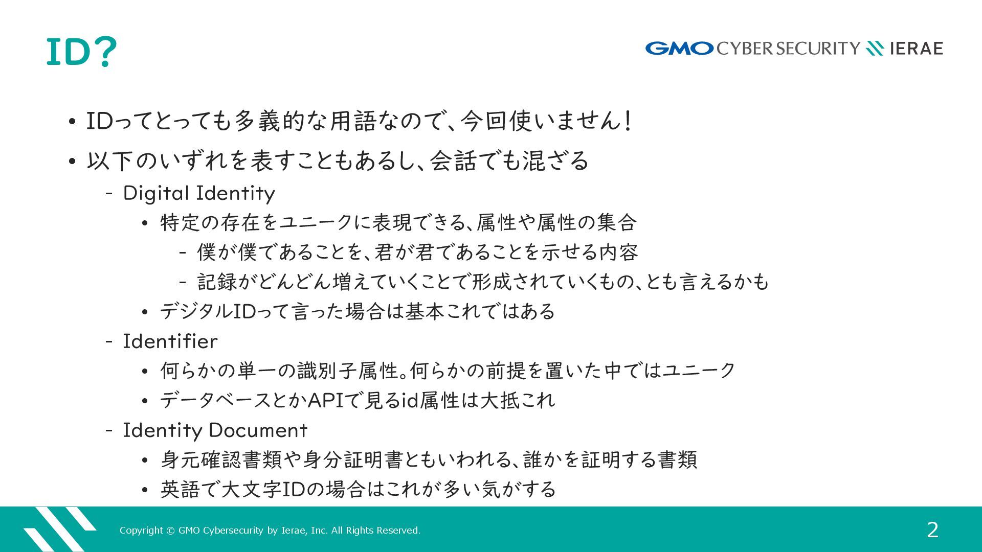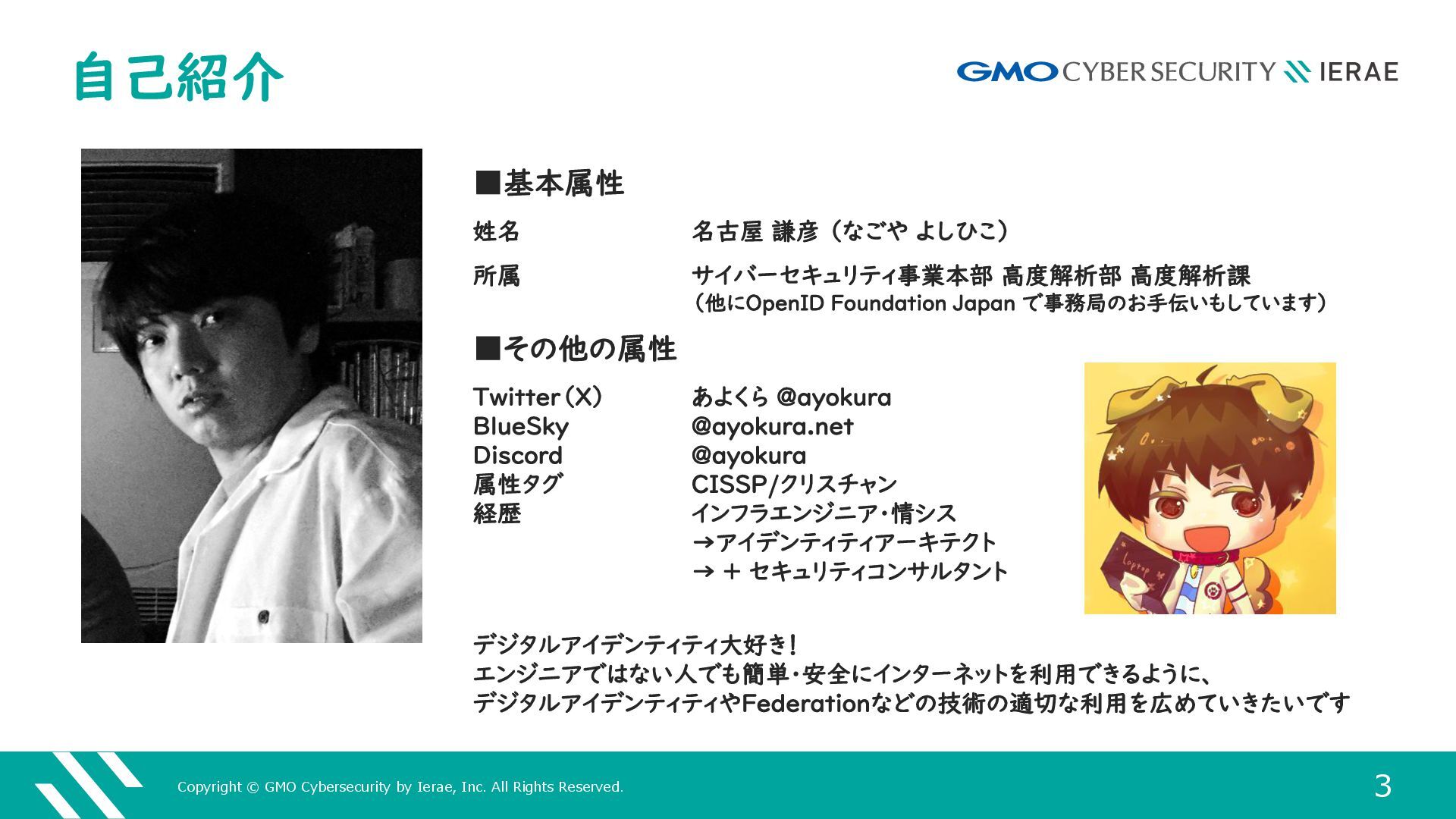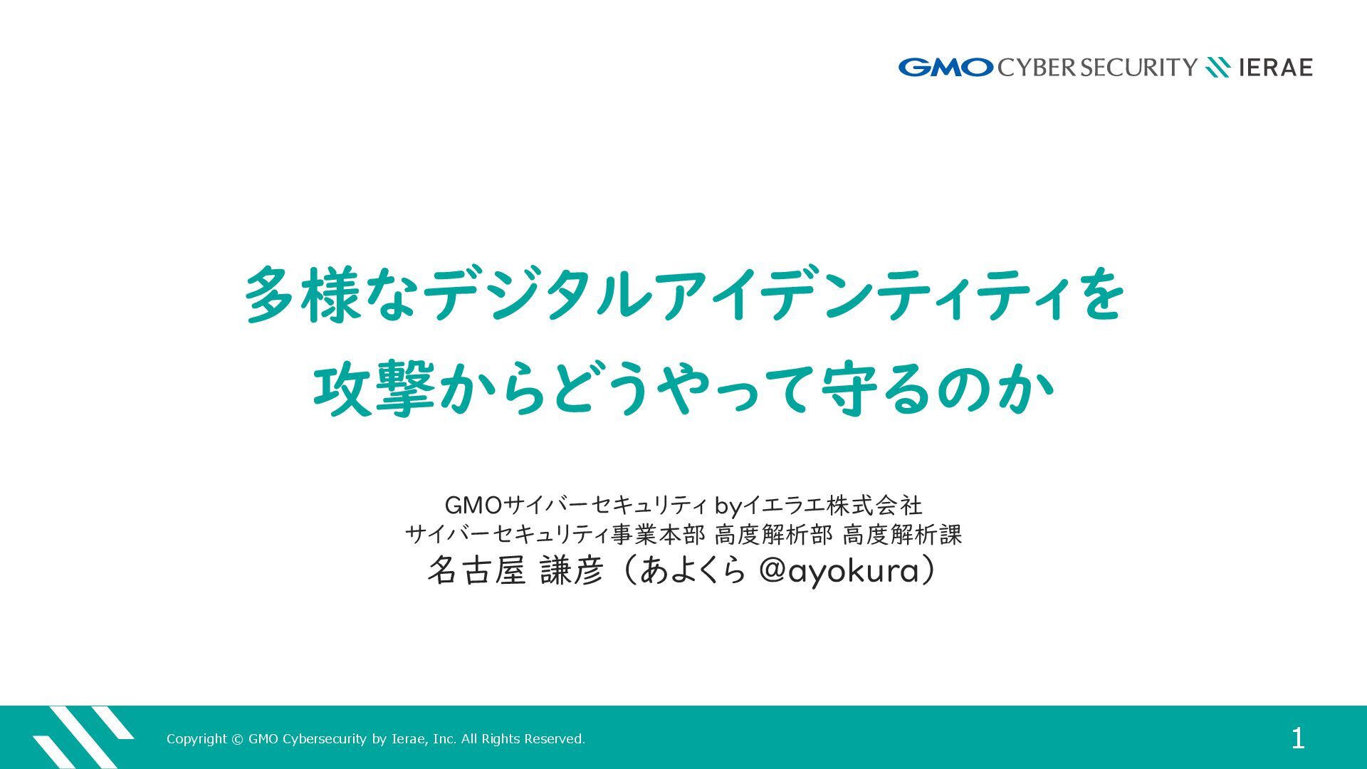 1 GMOサイバーセキュリティ byイエラエ株式会社 サイバーセキュリティ事業本部 高度解析部 高度解析課 名古屋 謙彦 (あよくら @ayokura) 多様なデジタルアイデンティティを 攻撃からどうやって守るのか