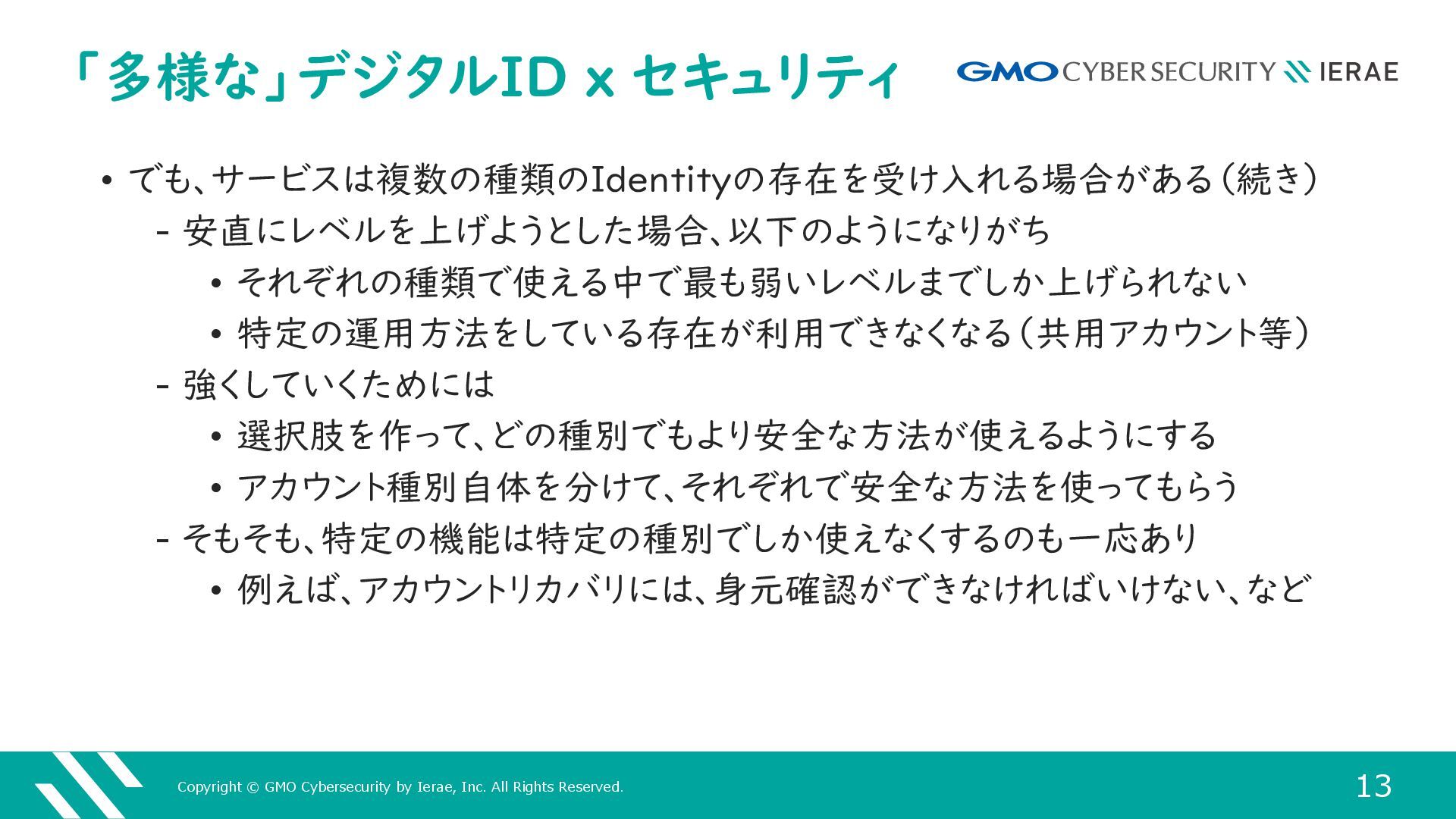 12 「多様な」デジタルID x セキュリティ • 単一の種別のIdentityのみが使えるサービスの場合 ‒ そのIdentityで使える最も強い方法を使えばいい • 法的裏付けのある個人のみなら、マイナンバーカード等のIdentity Document自体を使う • 個人の仮名アカウントのみなら、パスキーやFederationを使う • でも、サービスは複数の種類のIdentityの存在を受け入れる場合がある ‒ 意図せずのケースも、意図があってのケースもある • 仮名のみのつもりでも、アメリカでのサービス提供では、13歳未満と推測 できる情報を得た時点で、COPPAによりアカウント凍結が必要 ‒ この後、再度利用させるには法的な裏付けのある年齢確認が必須 • 結果として法的裏付けのある個人になってしまうことも