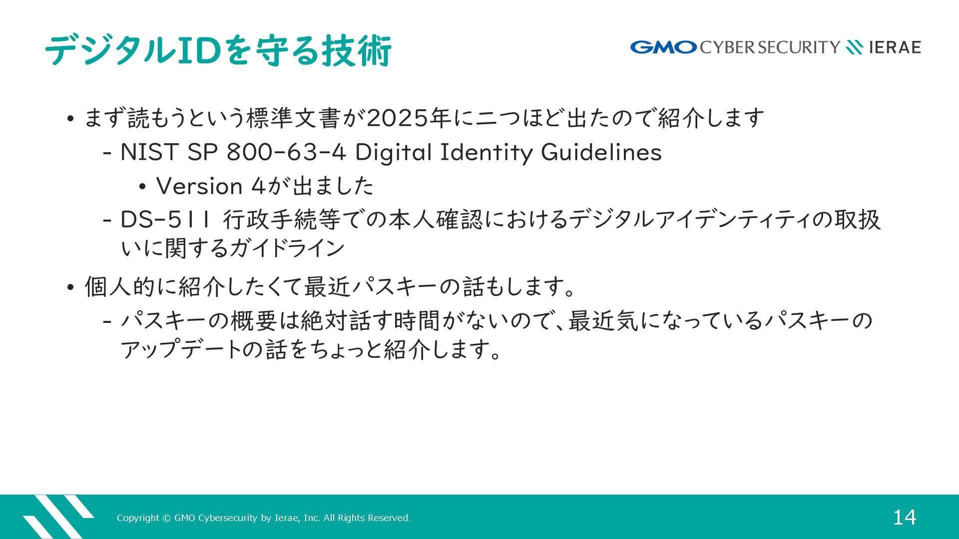 14 デジタルIDを守る技術 • まず読もうという標準文書が2025年に二つほど出たので紹介します ‒ NIST SP 800-63-4 Digital Identity Guidelines • Version 4が出ました ‒ DS-511 行政手続等での本人確認におけるデジタルアイデンティティの取扱 いに関するガイドライン • 個人的に紹介したくて最近パスキーの話もします。 ‒ パスキーの概要は絶対話す時間がないので、最近気になっているパスキーの アップデートの話をちょっと紹介します。