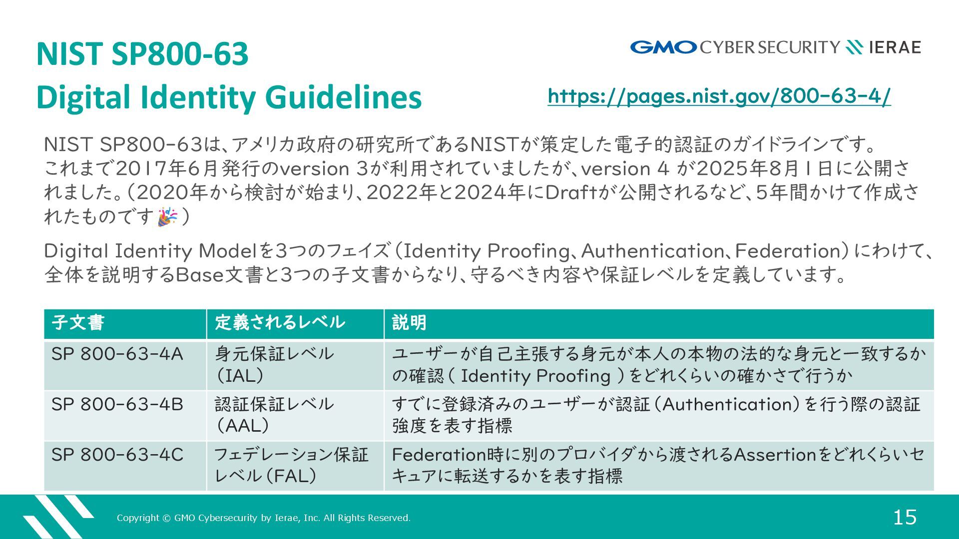 15 NIST SP800-63 Digital Identity Guidelines NIST SP800-63は、アメリカ政府の研究所であるNISTが策定した電子的認証のガイドラインです。 これまで2017年6月発行のversion 3が利用されていましたが、version 4 が2025年8月1日に公開さ れました。(2020年から検討が始まり、2022年と2024年にDraftが公開されるなど、5年間かけて作成さ れたものです ) Digital Identity Modelを3つのフェイズ(Identity Proofing、Authentication、Federation)にわけて、 全体を説明するBase文書と3つの子文書からなり、守るべき内容や保証レベルを定義しています。 https://pages.nist.gov/800-63-4/ 子文書 定義されるレベル 説明 SP 800-63-4A 身元保証レベル (IAL) ユーザーが自己主張する身元が本人の本物の法的な身元と一致するか の確認( Identity Proofing )をどれくらいの確かさで行うか SP 800-63-4B 認証保証レベル (AAL) すでに登録済みのユーザーが認証(Authentication)を行う際の認証 強度を表す指標 SP 800-63-4C フェデレーション保証 レベル(FAL) Federation時に別のプロバイダから渡されるAssertionをどれくらいセ キュアに転送するかを表す指標