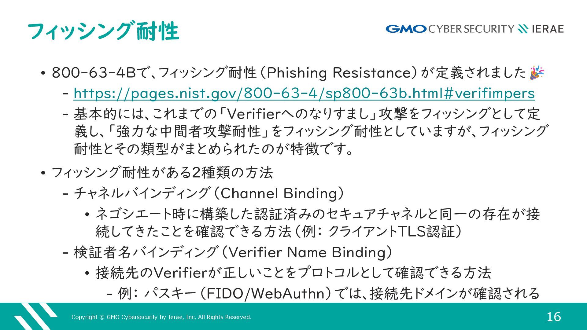 16 フィッシング耐性 • 800-63-4Bで、フィッシング耐性(Phishing Resistance)が定義されました ‒ https://pages.nist.gov/800-63-4/sp800-63b.html#verifimpers ‒ 基本的には、これまでの「Verifierへのなりすまし」攻撃をフィッシングとして定 義し、「強力な中間者攻撃耐性」をフィッシング耐性としていますが、フィッシング 耐性とその類型がまとめられたのが特徴です。 • フィッシング耐性がある2種類の方法 ‒ チャネルバインディング(Channel Binding) • ネゴシエート時に構築した認証済みのセキュアチャネルと同一の存在が接 続してきたことを確認できる方法(例: クライアントTLS認証) ‒ 検証者名バインディング(Verifier Name Binding) • 接続先のVerifierが正しいことをプロトコルとして確認できる方法 ‒ 例: パスキー(FIDO/WebAuthn)では、接続先ドメインが確認される