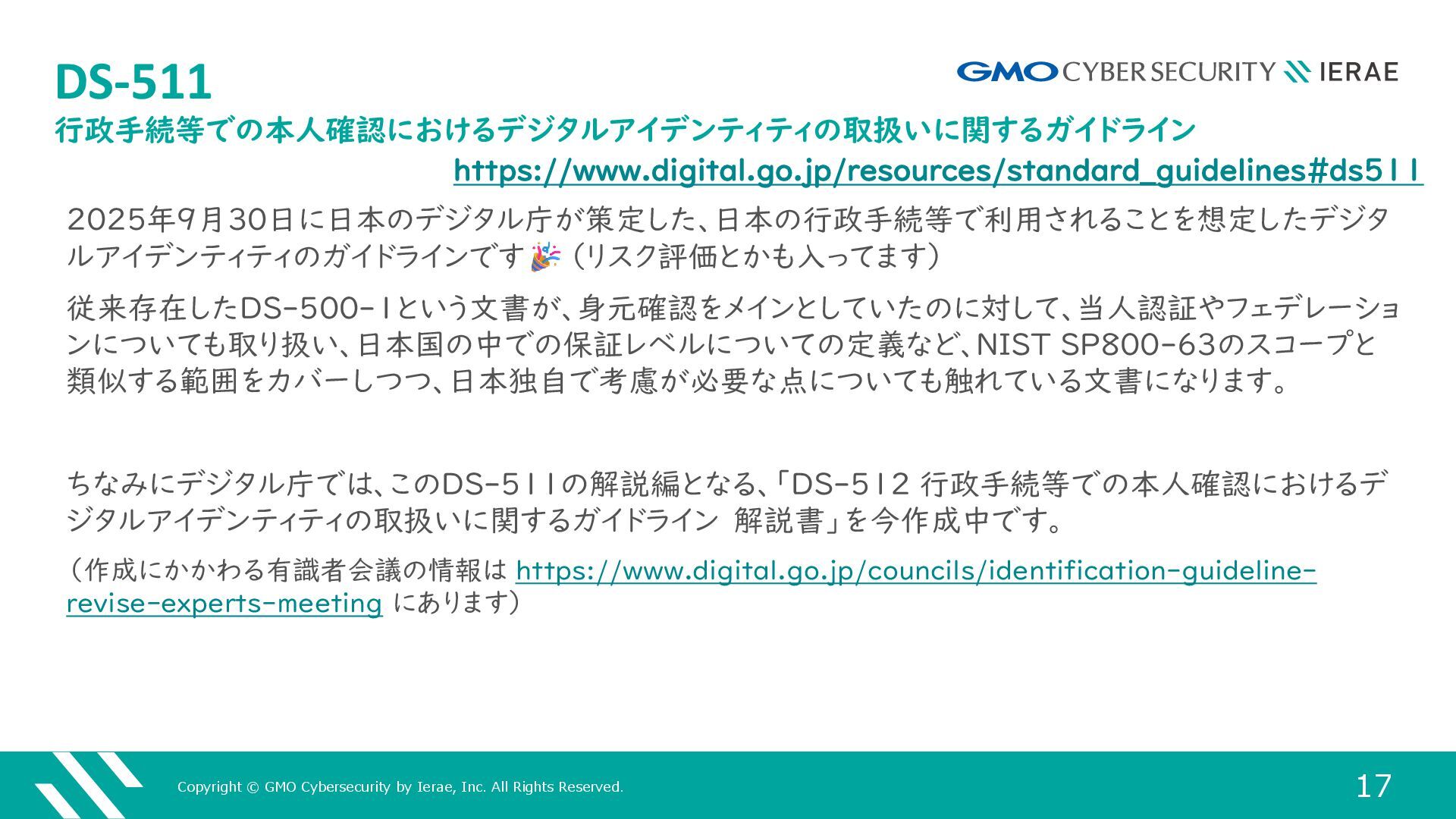 17 DS-511 行政手続等での本人確認におけるデジタルアイデンティティの取扱いに関するガイドライン 2025年9月30日に日本のデジタル庁が策定した、日本の行政手続等で利用されることを想定したデジタ ルアイデンティティのガイドラインです (リスク評価とかも入ってます) 従来存在したDS-500-1という文書が、身元確認をメインとしていたのに対して、当人認証やフェデレーショ ンについても取り扱い、日本国の中での保証レベルについての定義など、NIST SP800-63のスコープと 類似する範囲をカバーしつつ、日本独自で考慮が必要な点についても触れている文書になります。 ちなみにデジタル庁では、このDS-511の解説編となる、「DS-512 行政手続等での本人確認におけるデ ジタルアイデンティティの取扱いに関するガイドライン 解説書」を今作成中です。 (作成にかかわる有識者会議の情報は https://www.digital.go.jp/councils/identification-guideline- revise-experts-meeting にあります) https://www.digital.go.jp/resources/standard_guidelines#ds511