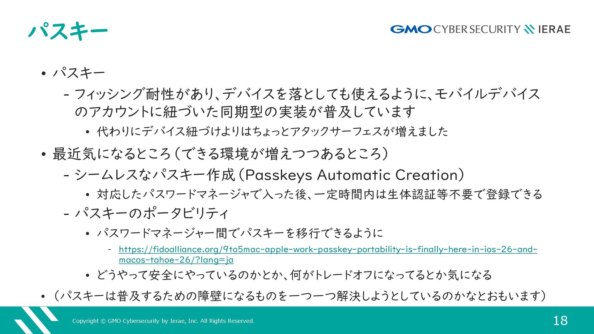 18 パスキー • パスキー ‒ フィッシング耐性があり、デバイスを落としても使えるように、モバイルデバイス のアカウントに紐づいた同期型の実装が普及しています • 代わりにデバイス紐づけよりはちょっとアタックサーフェスが増えました • 最近気になるところ(できる環境が増えつつあるところ) ‒ シームレスなパスキー作成(Passkeys Automatic Creation) • 対応したパスワードマネージャで入った後、一定時間内は生体認証等不要で登録できる ‒ パスキーのポータビリティ • パスワードマネージャー間でパスキーを移行できるように ‒ https://fidoalliance.org/9to5mac-apple-work-passkey-portability-is-finally-here-in-ios-26-and- macos-tahoe-26/?lang=ja • どうやって安全にやっているのかとか、何がトレードオフになってるとか気になる • (パスキーは普及するための障壁になるものを一つ一つ解決しようとしているのかなとおもいます)