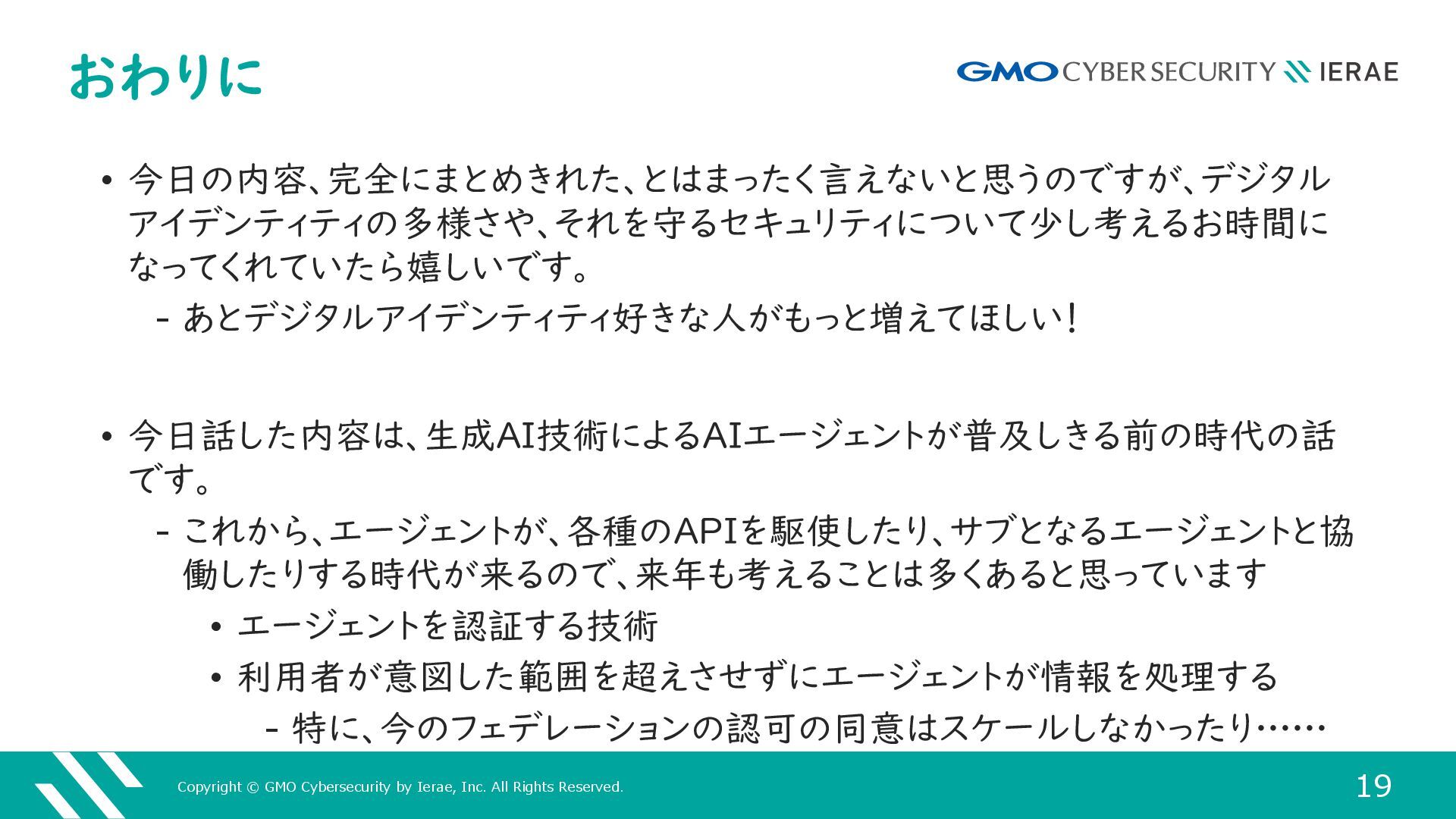 19 おわりに • 今日の内容、完全にまとめきれた、とはまったく言えないと思うのですが、デジタル アイデンティティの多様さや、それを守るセキュリティについて少し考えるお時間に なってくれていたら嬉しいです。 ‒ あとデジタルアイデンティティ好きな人がもっと増えてほしい! • 今日話した内容は、生成AI技術によるAIエージェントが普及しきる前の時代の話 です。 ‒ これから、エージェントが、各種のAPIを駆使したり、サブとなるエージェントと協 働したりする時代が来るので、来年も考えることは多くあると思っています • エージェントを認証する技術 • 利用者が意図した範囲を超えさせずにエージェントが情報を処理する ‒ 特に、今のフェデレーションの認可の同意はスケールしなかったり……