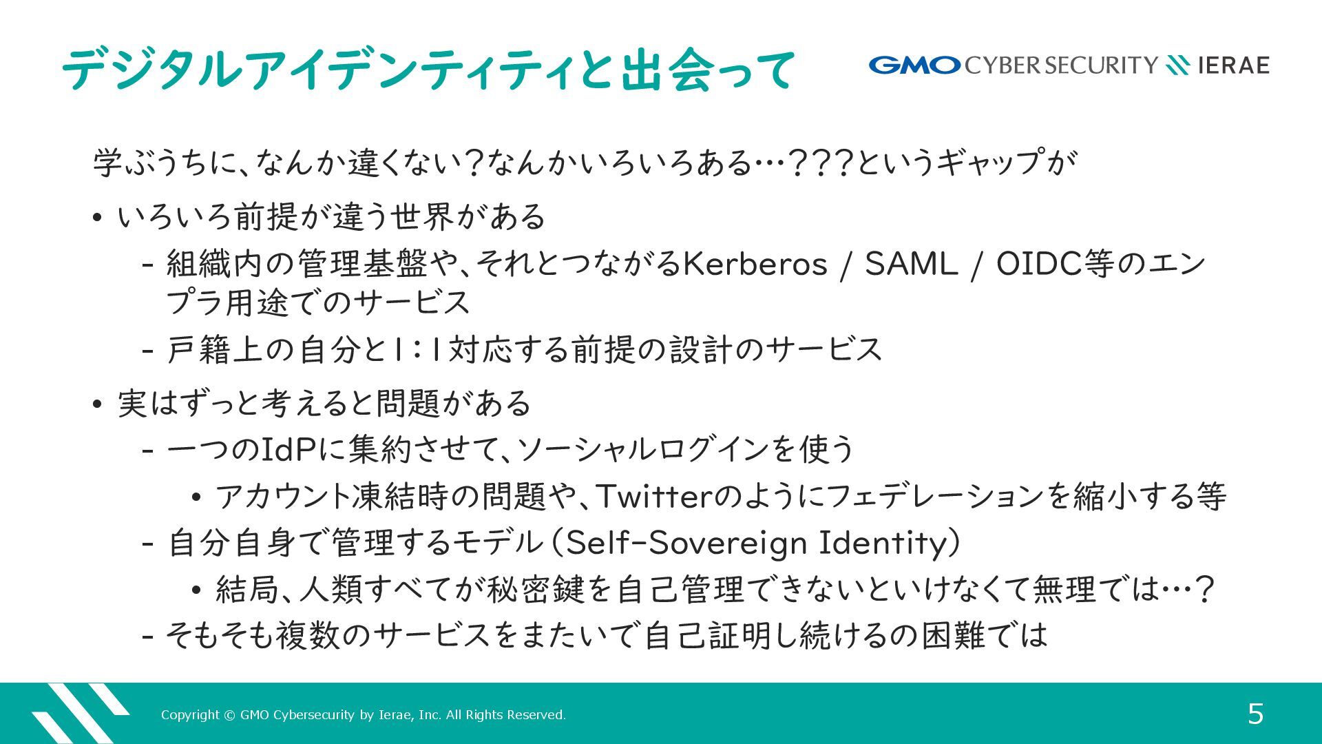 4 デジタルアイデンティティとの出会い • その1 ‒ 中学生のころにMMORPG等のハンドルネームやアバターの文化にはまる ‒ その後も、Twitterを活用したり、あるいはVTuberにはまったりする • いわゆる仮名のアカウント・デジタルアイデンティティを、サービス間をまた いだり、サービスの寿命を超えて維持する等について、強く関心がある • その2 ‒ 小学校時代の転校や、大学で関東に戻ったりなどで、身近な人たちが物理的 な距離が離れることがあった ‒ どうせなら身近な人たちが安全にIT技術に触れてほしい • 鍵になったのが認証やFederationの技術