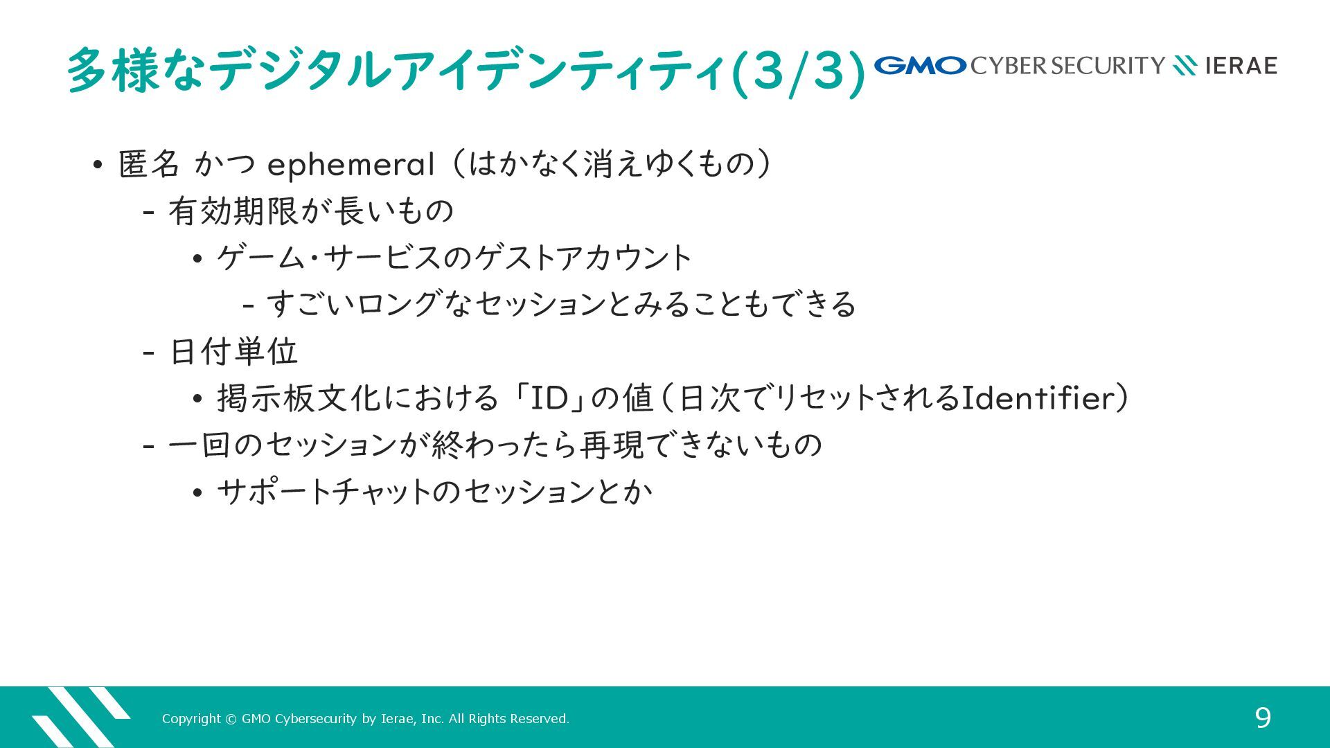 9 多様なデジタルアイデンティティ(3/3) • 匿名 かつ ephemeral (はかなく消えゆくもの) ‒ 有効期限が長いもの • ゲーム・サービスのゲストアカウント ‒ すごいロングなセッションとみることもできる ‒ 日付単位 • 掲示板文化における 「ID」の値(日次でリセットされるIdentifier) ‒ 一回のセッションが終わったら再現できないもの • サポートチャットのセッションとか