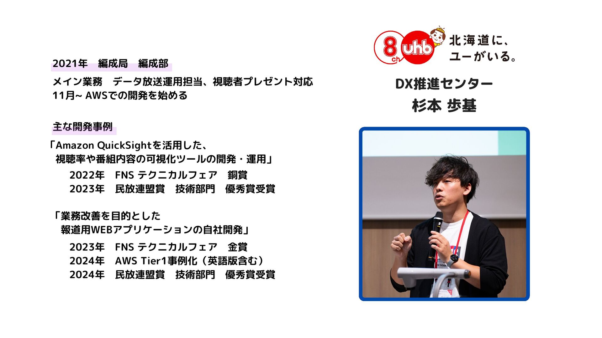 2023年 民放連盟賞 技術部門 優秀賞受賞 2023年 FNS テクニカルフェア 金賞 2024年 AWS Tier1事例化(英語版含む) 2024年 民放連盟賞 技術部門 優秀賞受賞 「業務改善を目的とした 報道用WEBアプリケーションの自社開発」 DX推進センター 杉本 歩基