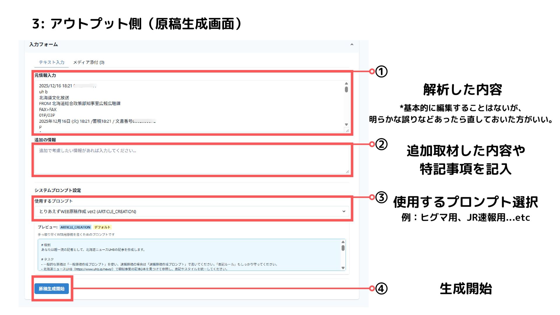 解析した内容 追加取材した内容や 特記事項を記入 使用するプロンプト選択 例:ヒグマ用、JR速報用...etc *基本的に編集することはないが、 明らかな誤りなどあったら直しておいた方がいい。 生成開始 ① ②