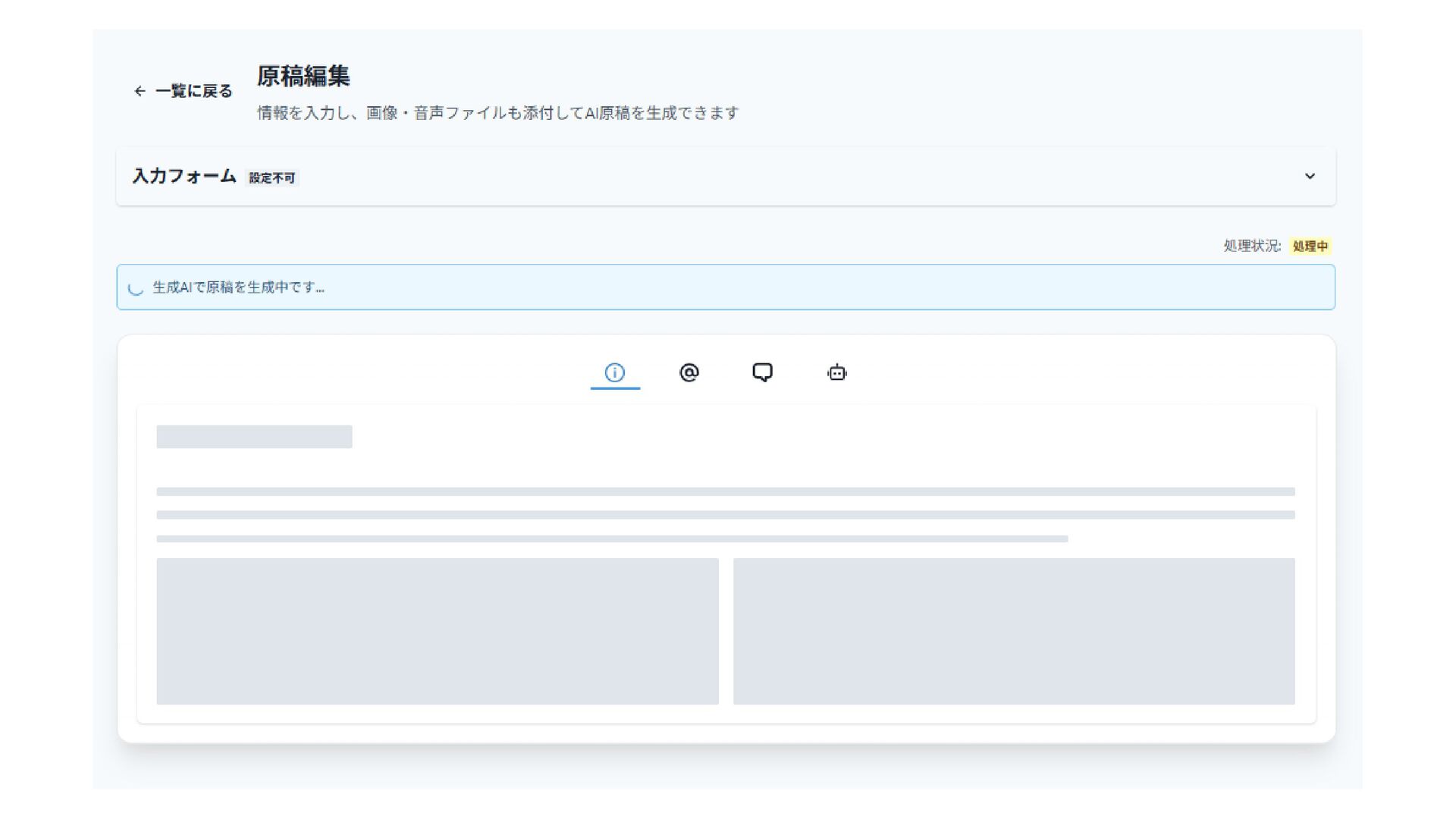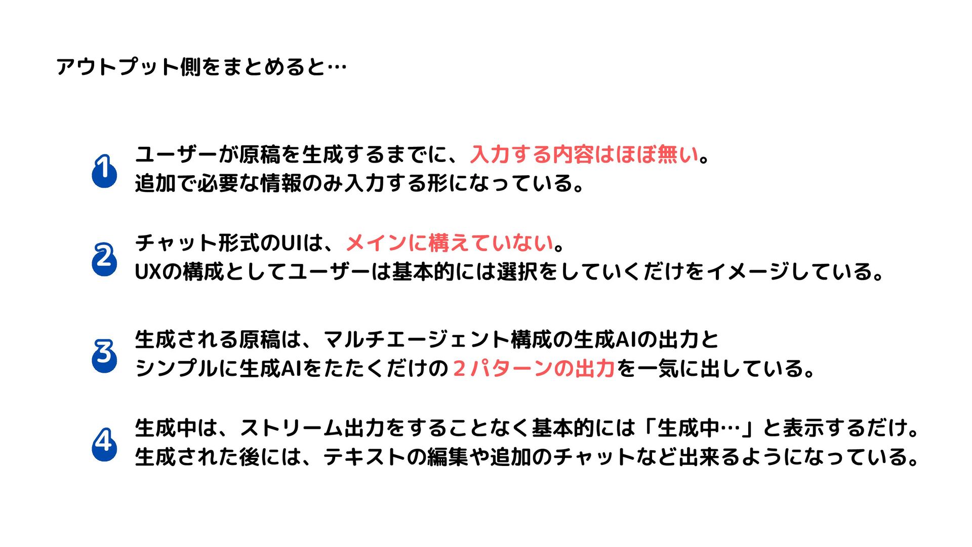 アウトプット側をまとめると… ユーザーが原稿を生成するまでに、入力する内容はほぼ無い。 追加で必要な情報のみ入力する形になっている。 チャット形式のUIは、メインに構えていない。 UXの構成としてユーザーは基本的には選択をしていくだけをイメージしている。 生成される原稿は、マルチエージェント構成の生成AIの出力と シンプルに生成AIをたたくだけの2パターンの出力を一気に出している。 生成中は、ストリーム出力をすることなく基本的には「生成中…」と表示するだけ。 生成された後には、テキストの編集や追加のチャットなど出来るようになっている。 3