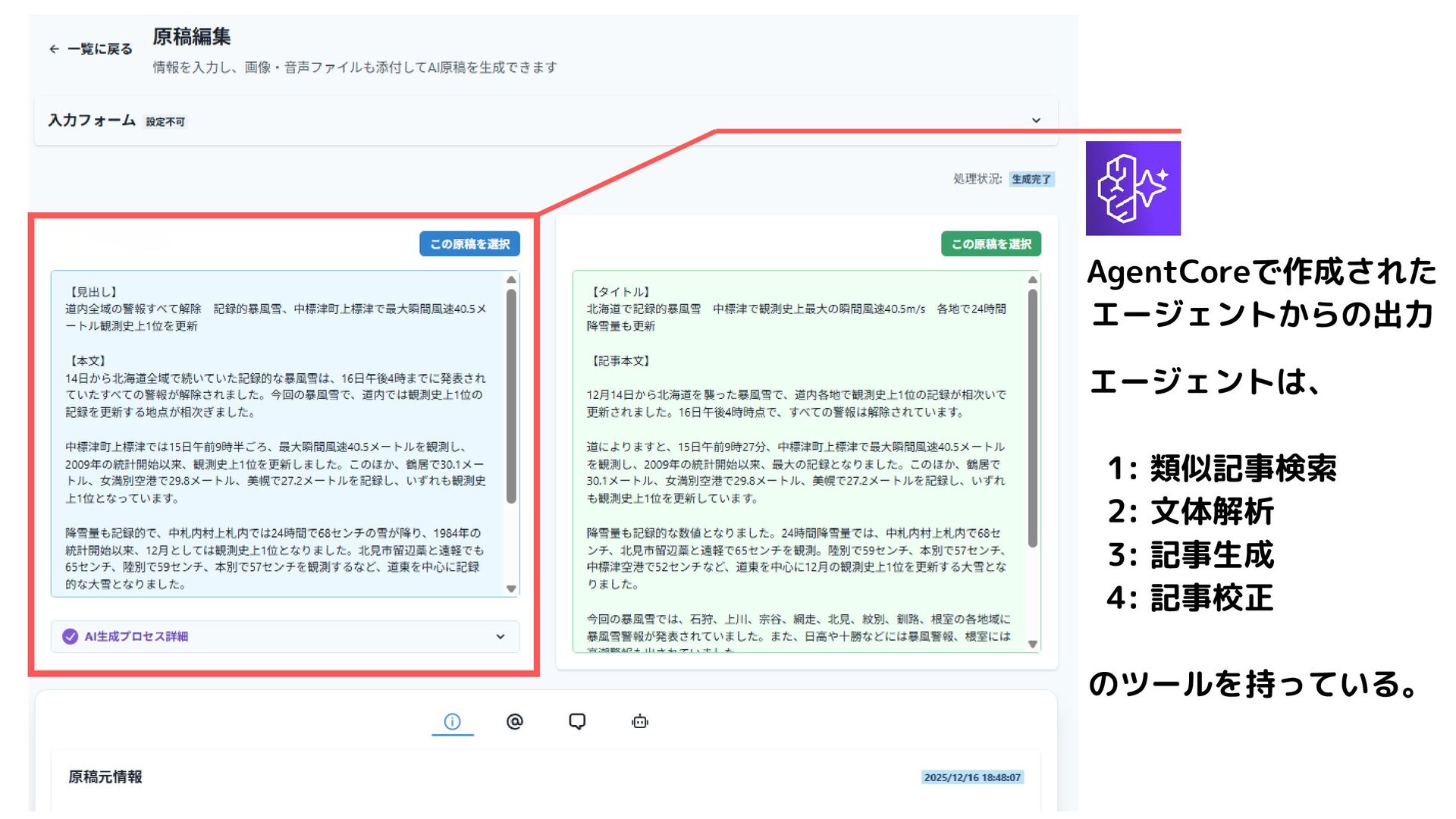 AgentCoreで作成された エージェントからの出力 エージェントは、 1: 類似記事検索 2: 文体解析 3: 記事生成 4: