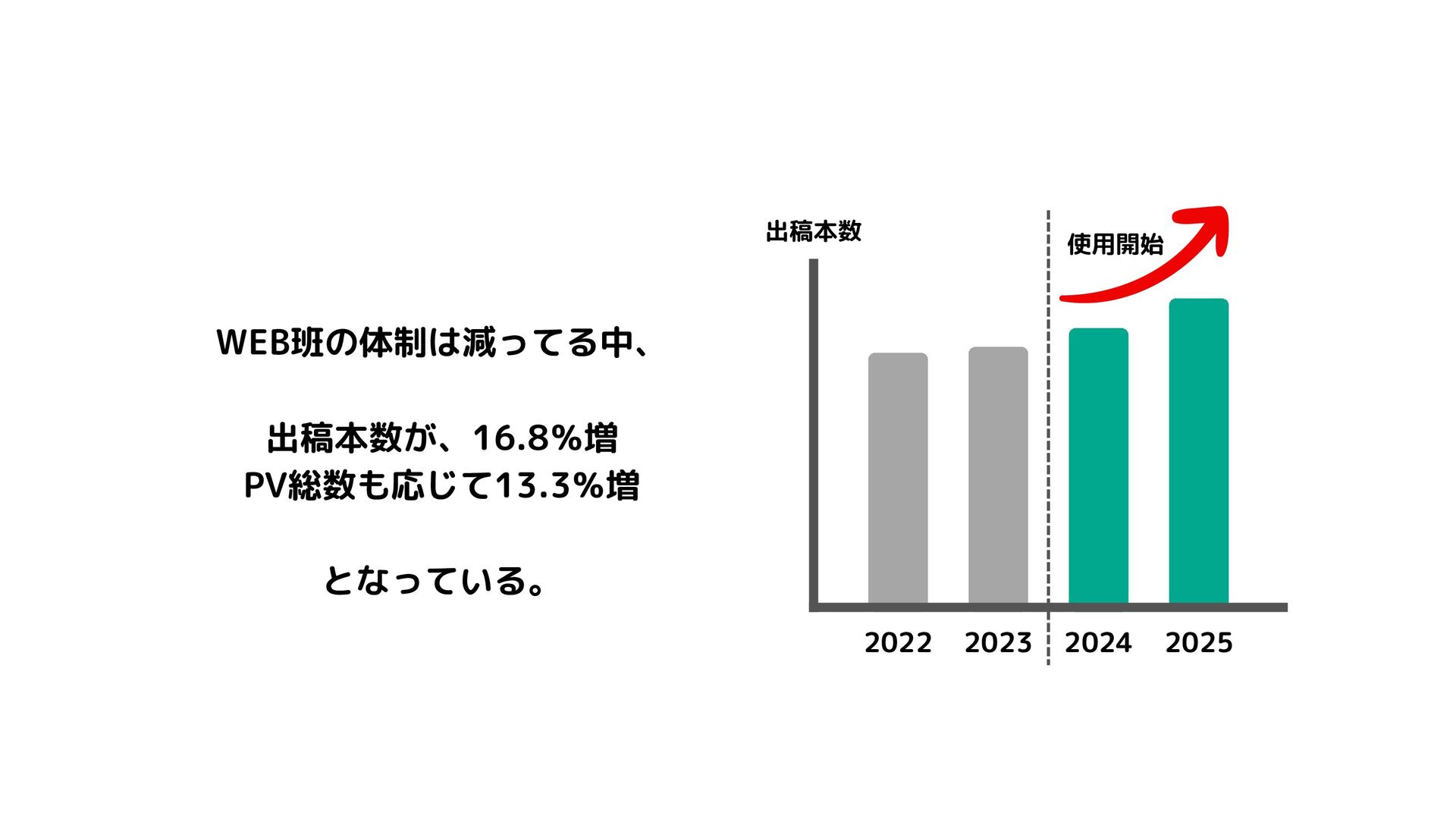 WEB班の体制は減ってる中、 出稿本数が、16.8%増 PV総数も応じて13.3%増 となっている。 2022 2023 2024 2025 使用開始 出稿本数