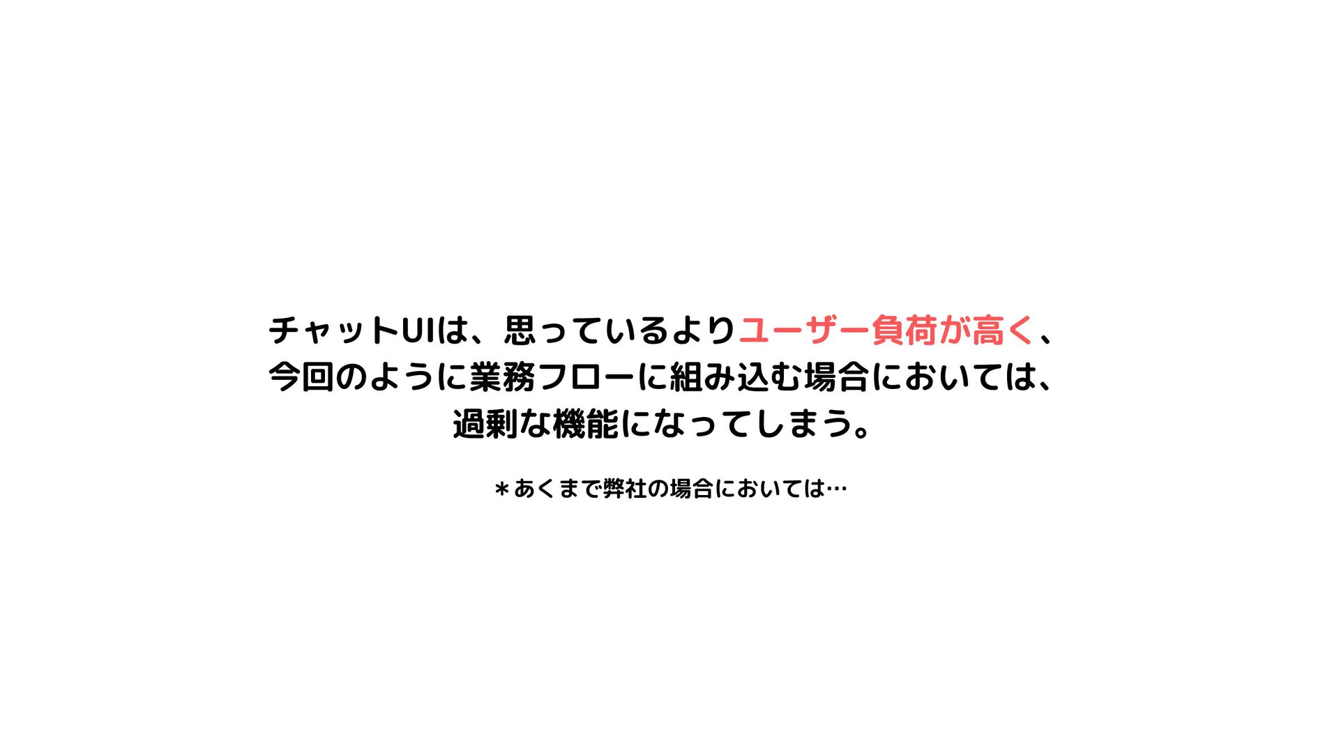 チャットUIは、思っているよりユーザー負荷が高く、 今回のように業務フローに組み込む場合においては、 過剰な機能になってしまう。 *あくまで弊社の場合においては…