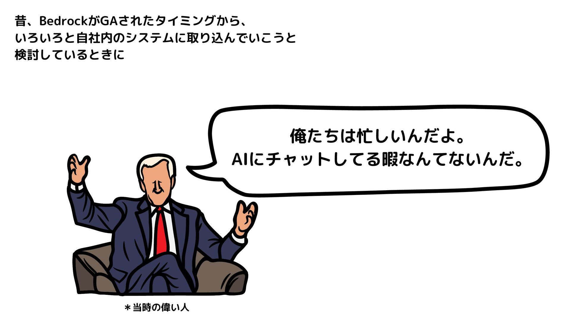俺たちは忙しいんだよ。 AIにチャットしてる暇なんてないんだ。 昔、BedrockがGAされたタイミングから、 いろいろと自社内のシステムに取り込んでいこうと 検討しているときに *当時の偉い人
