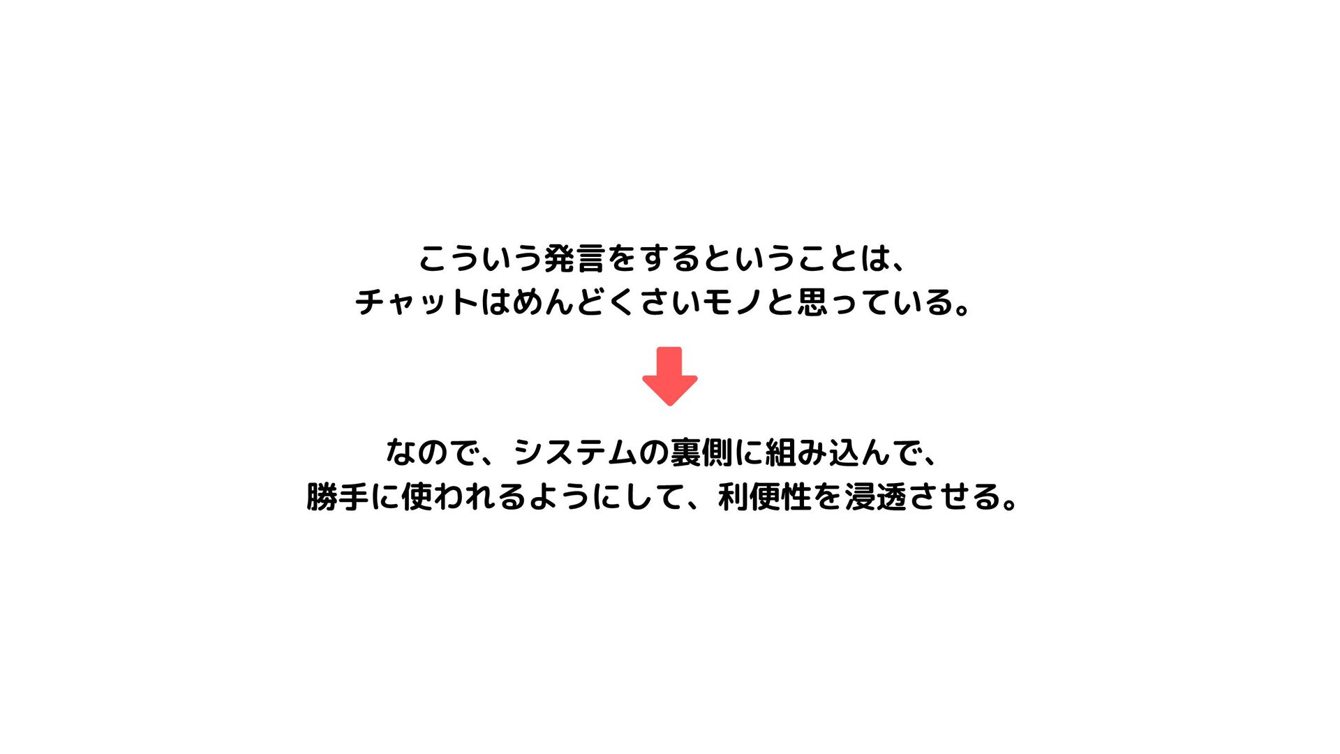 こういう発言をするということは、 チャットはめんどくさいモノと思っている。 なので、システムの裏側に組み込んで、 勝手に使われるようにして、利便性を浸透させる。