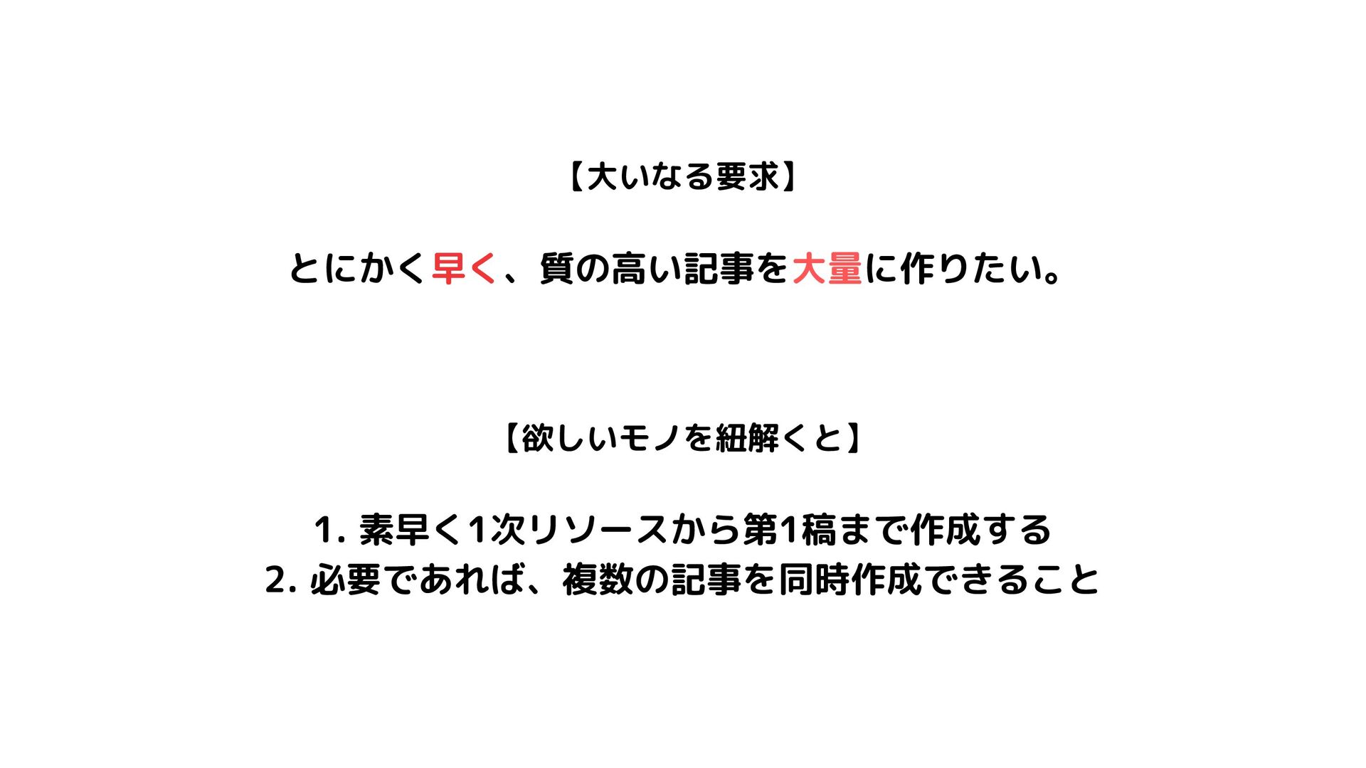 【欲しいモノを紐解くと】 1. 素早く1次リソースから第1稿まで作成する 2. 必要であれば、複数の記事を同時作成できること 【大いなる要求】 とにかく早く、質の高い記事を大量に作りたい。