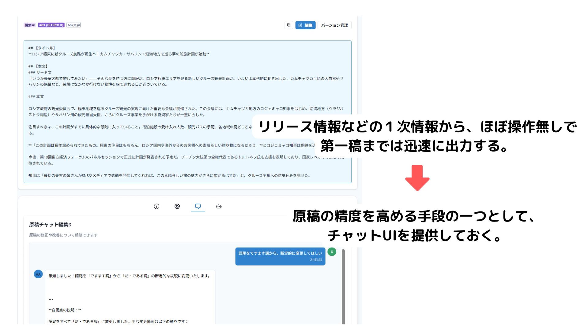 リリース情報などの1次情報から、ほぼ操作無しで 第一稿までは迅速に出力する。 原稿の精度を高める手段の一つとして、 チャットUIを提供しておく。
