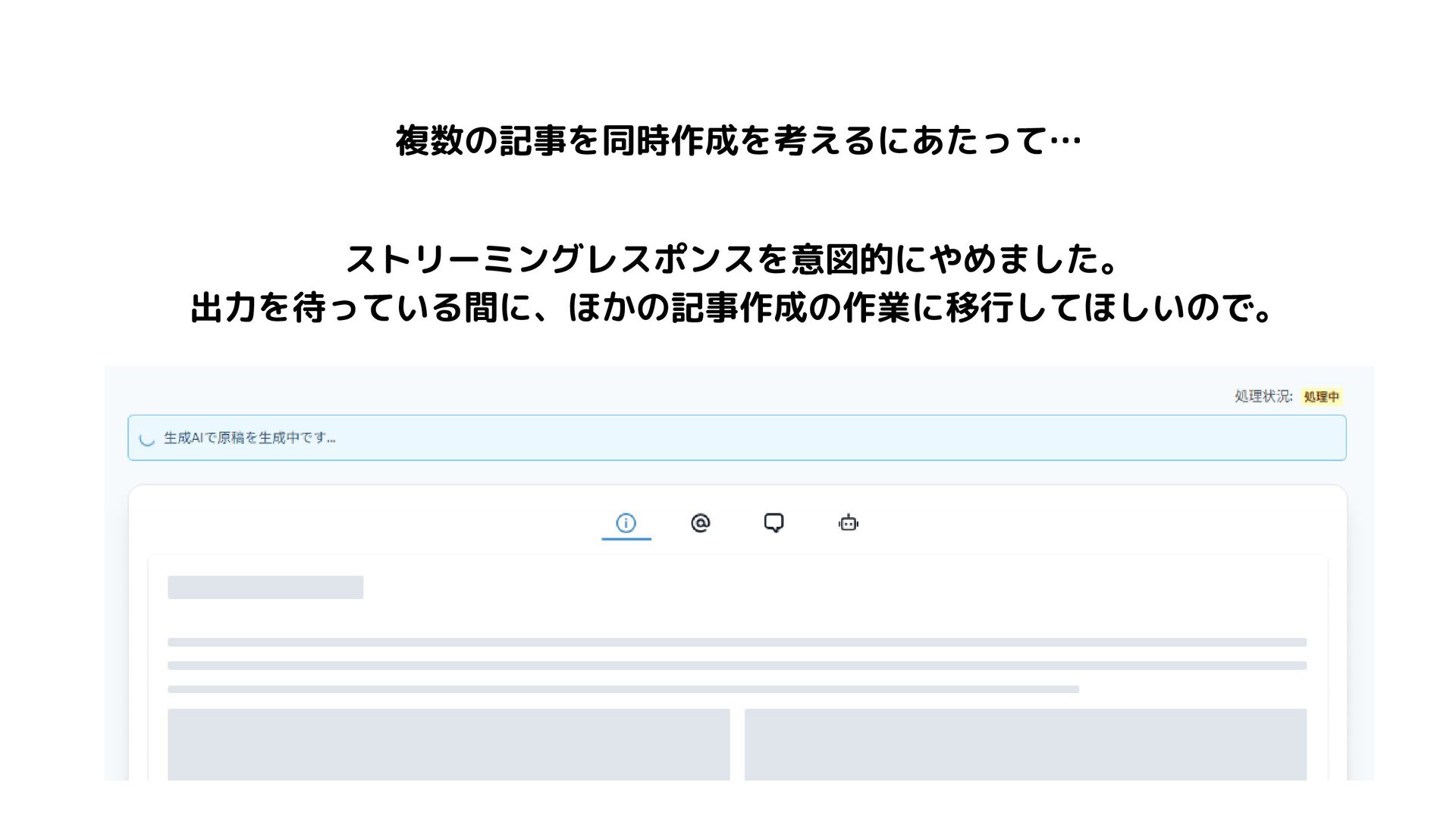 ストリーミングレスポンスを意図的にやめました。 出力を待っている間に、ほかの記事作成の作業に移行してほしいので。 複数の記事を同時作成を考えるにあたって…