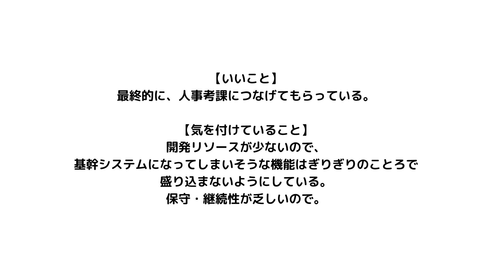 【いいこと】 最終的に、人事考課につなげてもらっている。 【気を付けていること】 開発リソースが少ないので、 基幹システムになってしまいそうな機能はぎりぎりのことろで 盛り込まないようにしている。 保守・継続性が乏しいので。