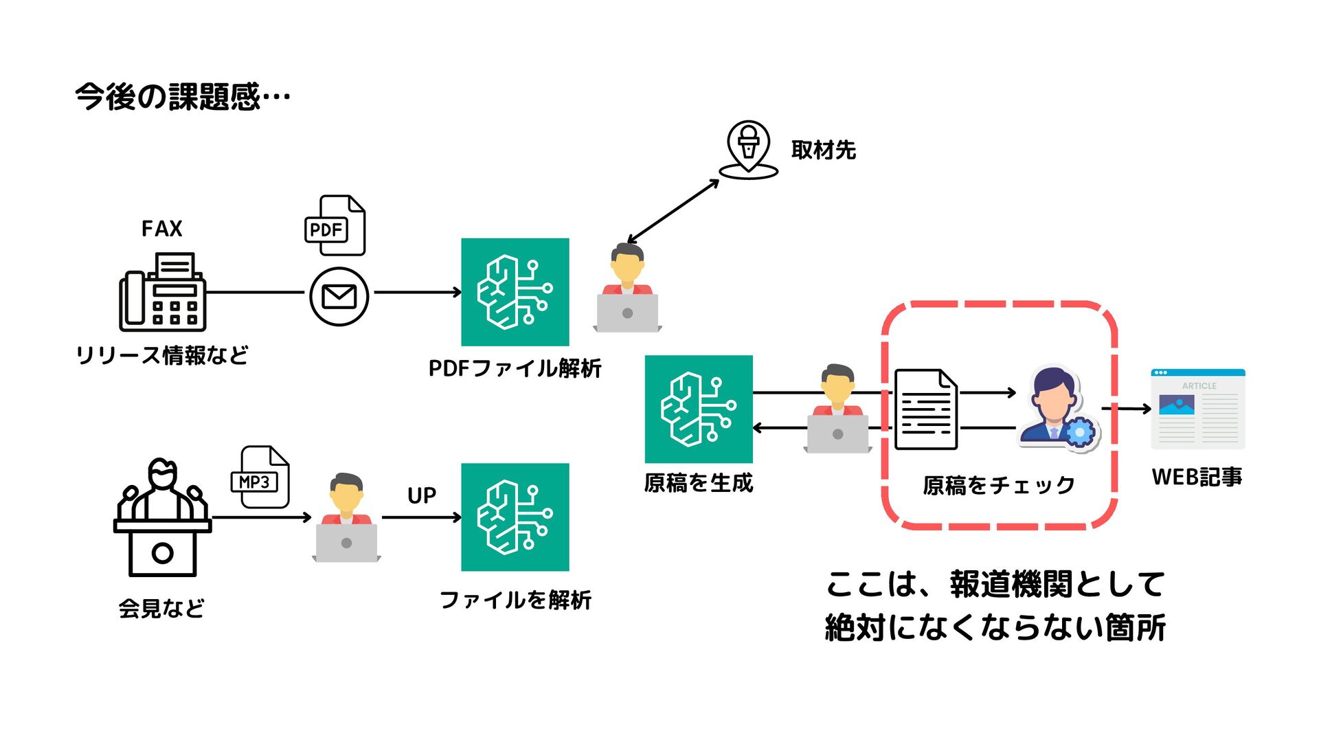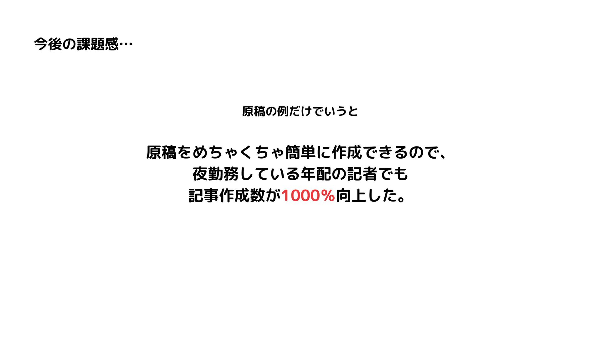 原稿をめちゃくちゃ簡単に作成できるので、 夜勤務している年配の記者でも 記事作成数が1000%向上した。 原稿の例だけでいうと 今後の課題感…