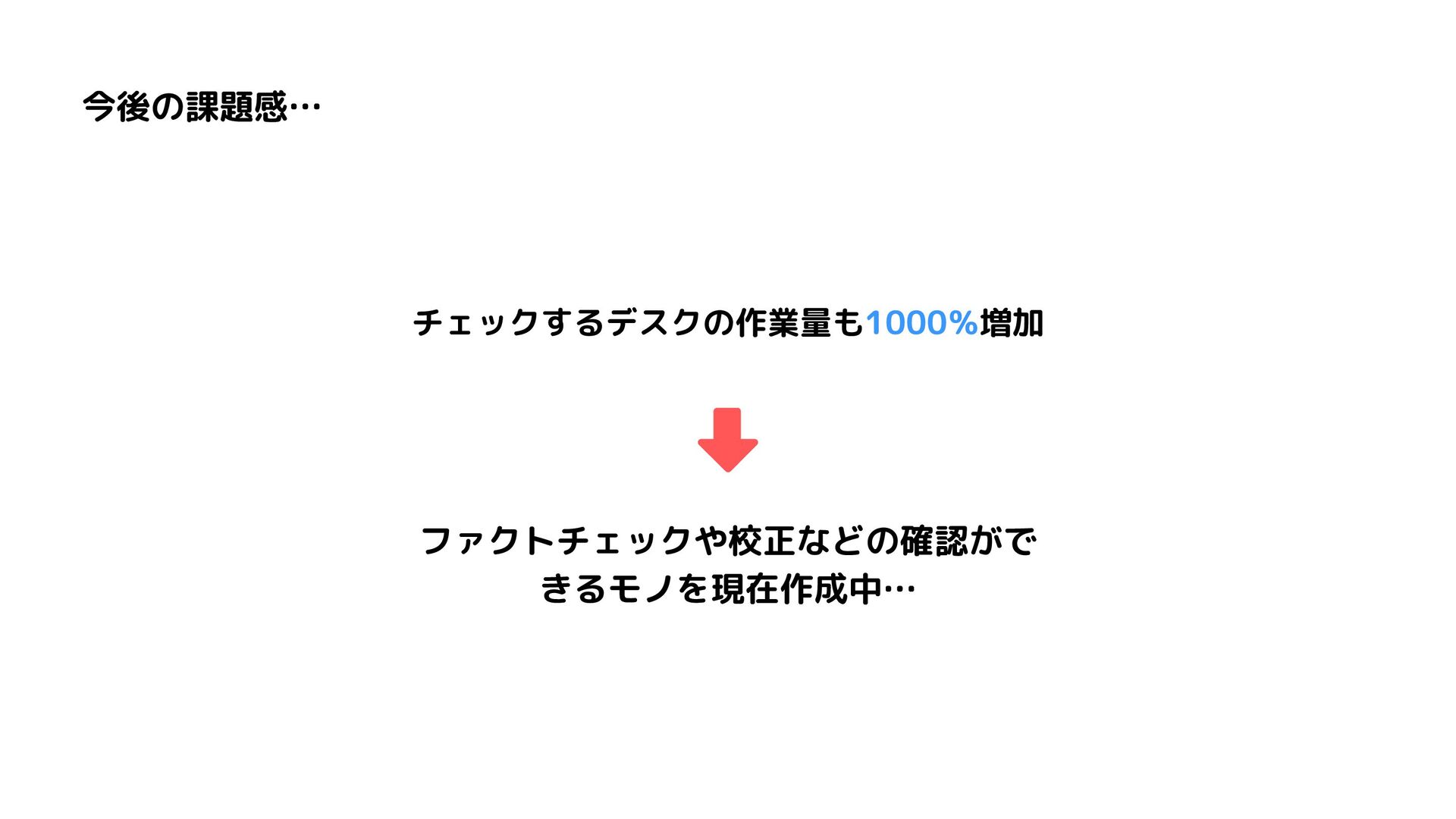 チェックするデスクの作業量も1000%増加 今後の課題感… ファクトチェックや校正などの確認がで きるモノを現在作成中…