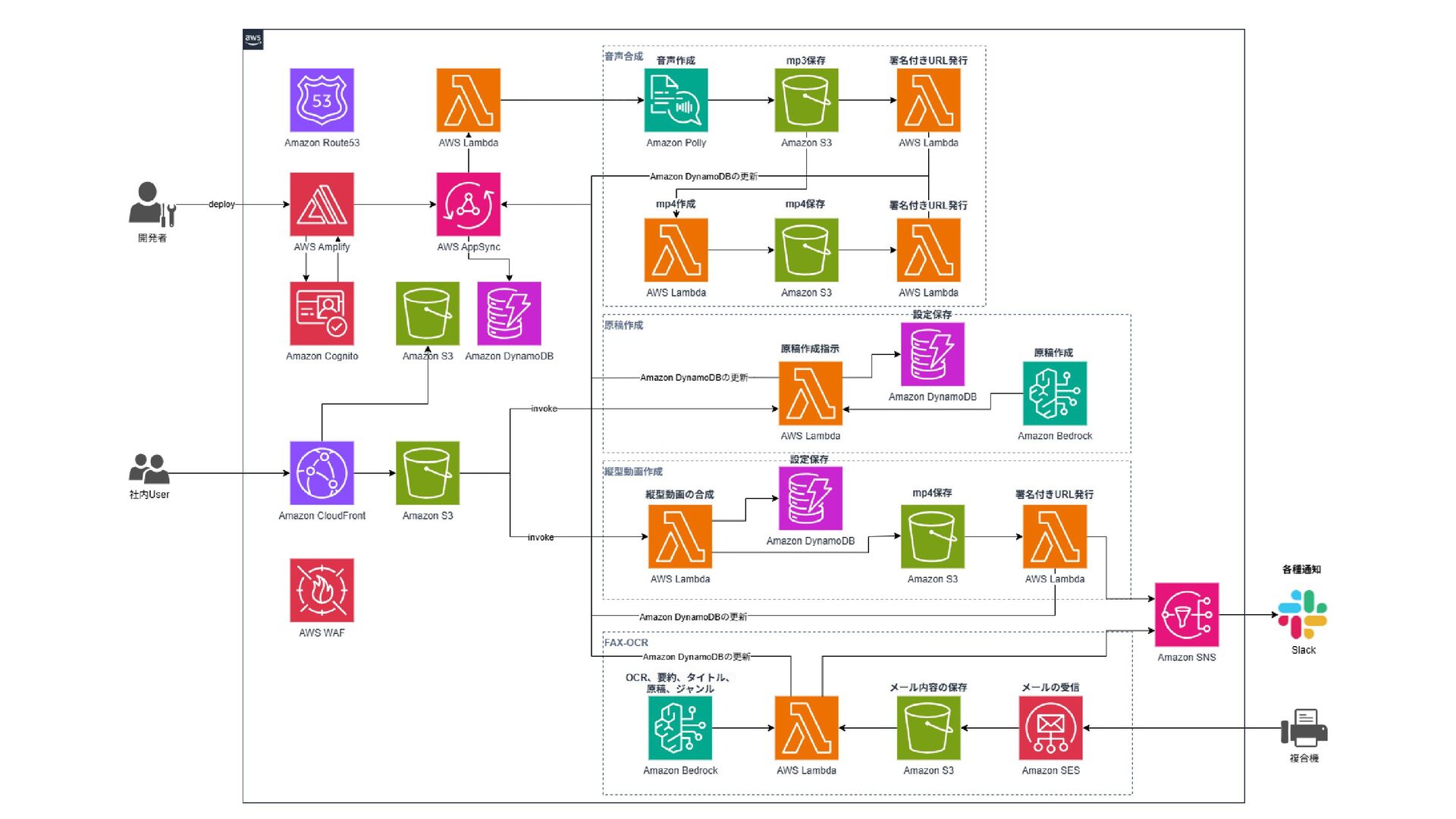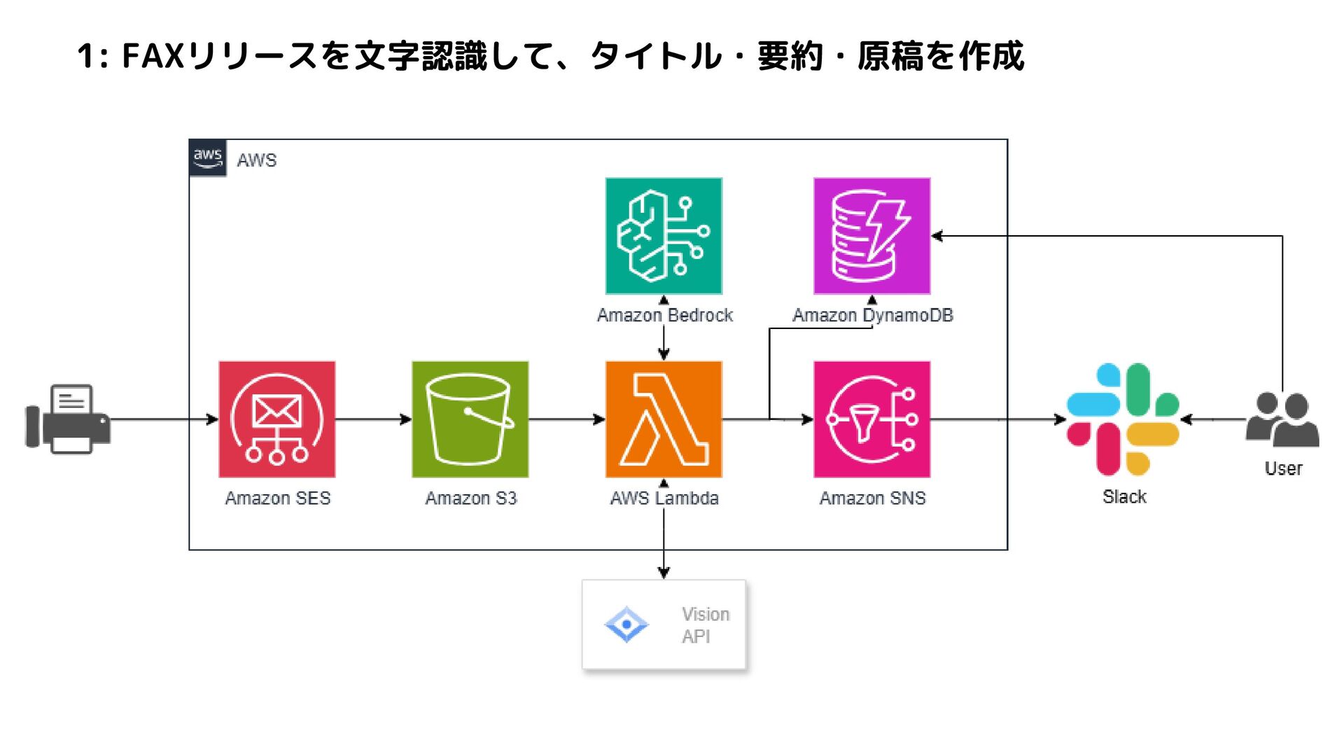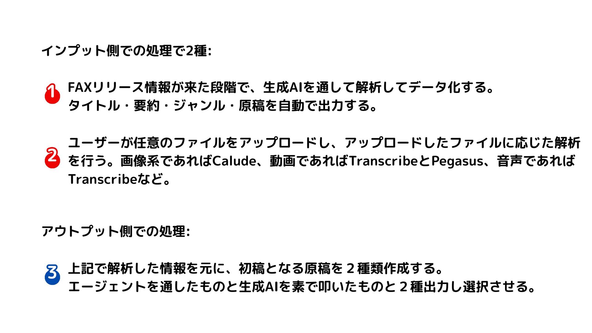 インプット側での処理で2種: FAXリリース情報が来た段階で、生成AIを通して解析してデータ化する。 タイトル・要約・ジャンル・原稿を自動で出力する。 ユーザーが任意のファイルをアップロードし、アップロードしたファイルに応じた解析 を行う。画像系であればCalude、動画であればTranscribeとPegasus、音声であれば Transcribeなど。 アウトプット側での処理: 上記で解析した情報を元に、初稿となる原稿を2種類作成する。 エージェントを通したものと生成AIを素で叩いたものと2種出力し選択させる。 1