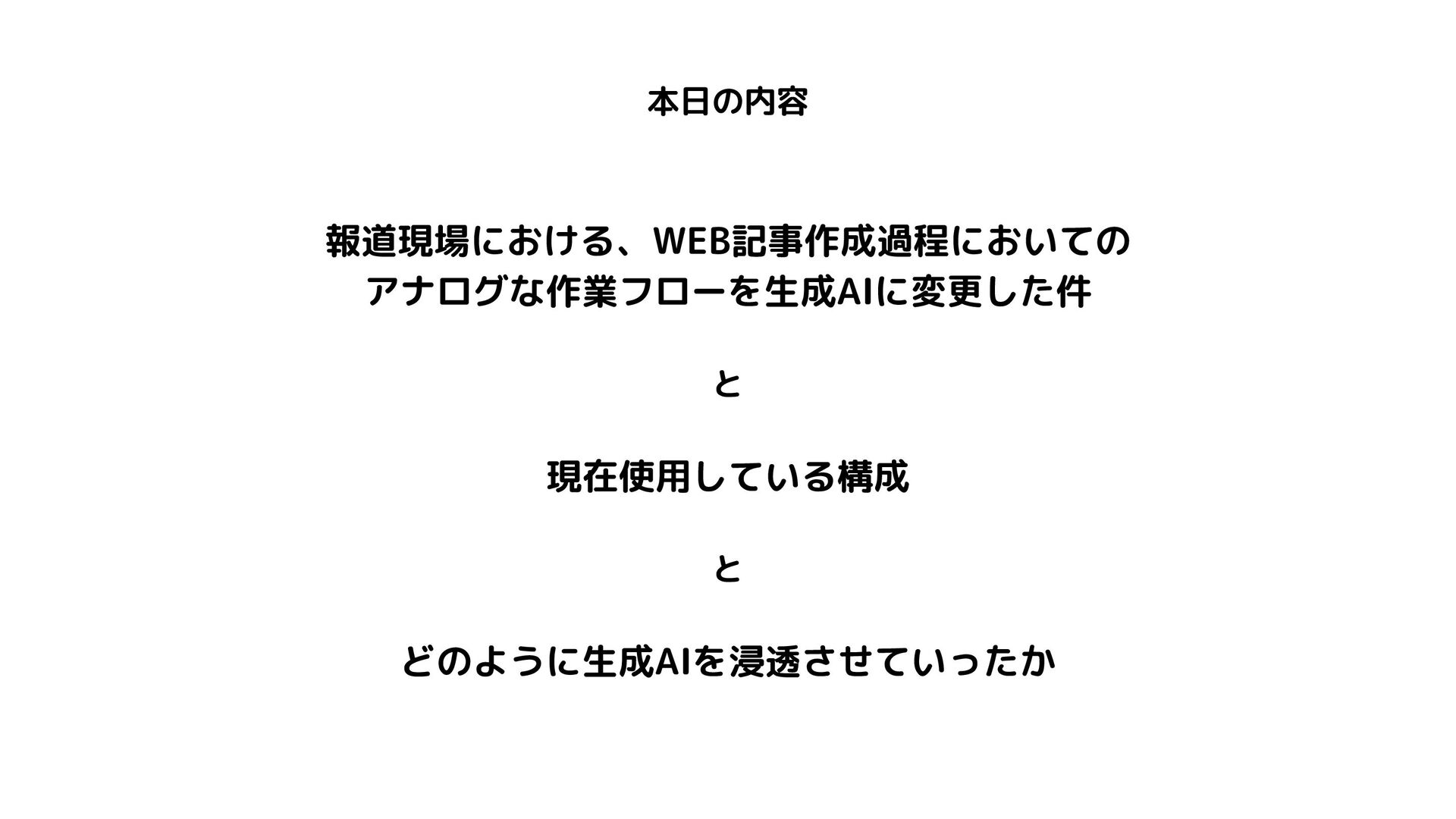 報道現場における、WEB記事作成過程においての アナログな作業フローを生成AIに変更した件 と 現在使用している構成 と どのように生成AIを浸透させていったか 本日の内容