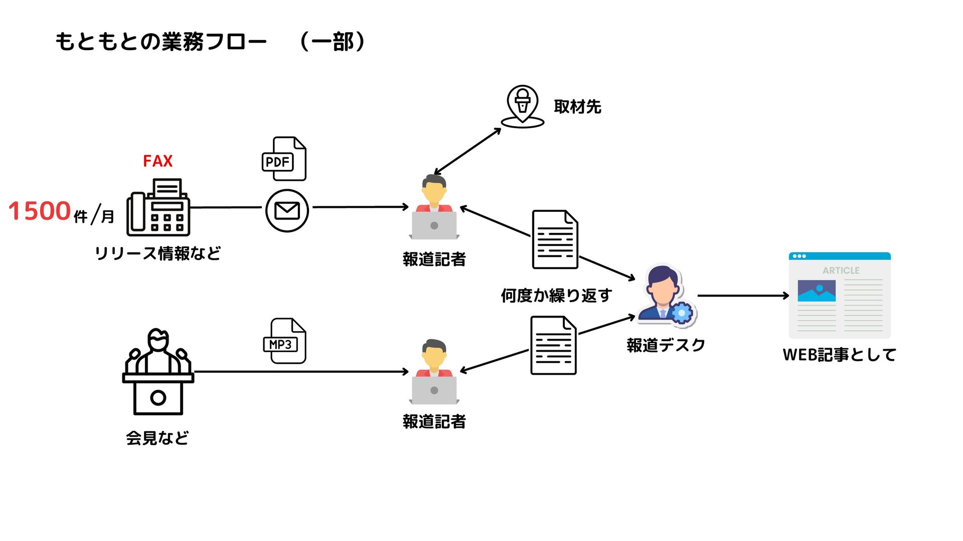 もともとの業務フロー (一部) 会見など リリース情報など 報道記者 報道記者 報道デスク 取材先 WEB記事として FAX 何度か繰り返す