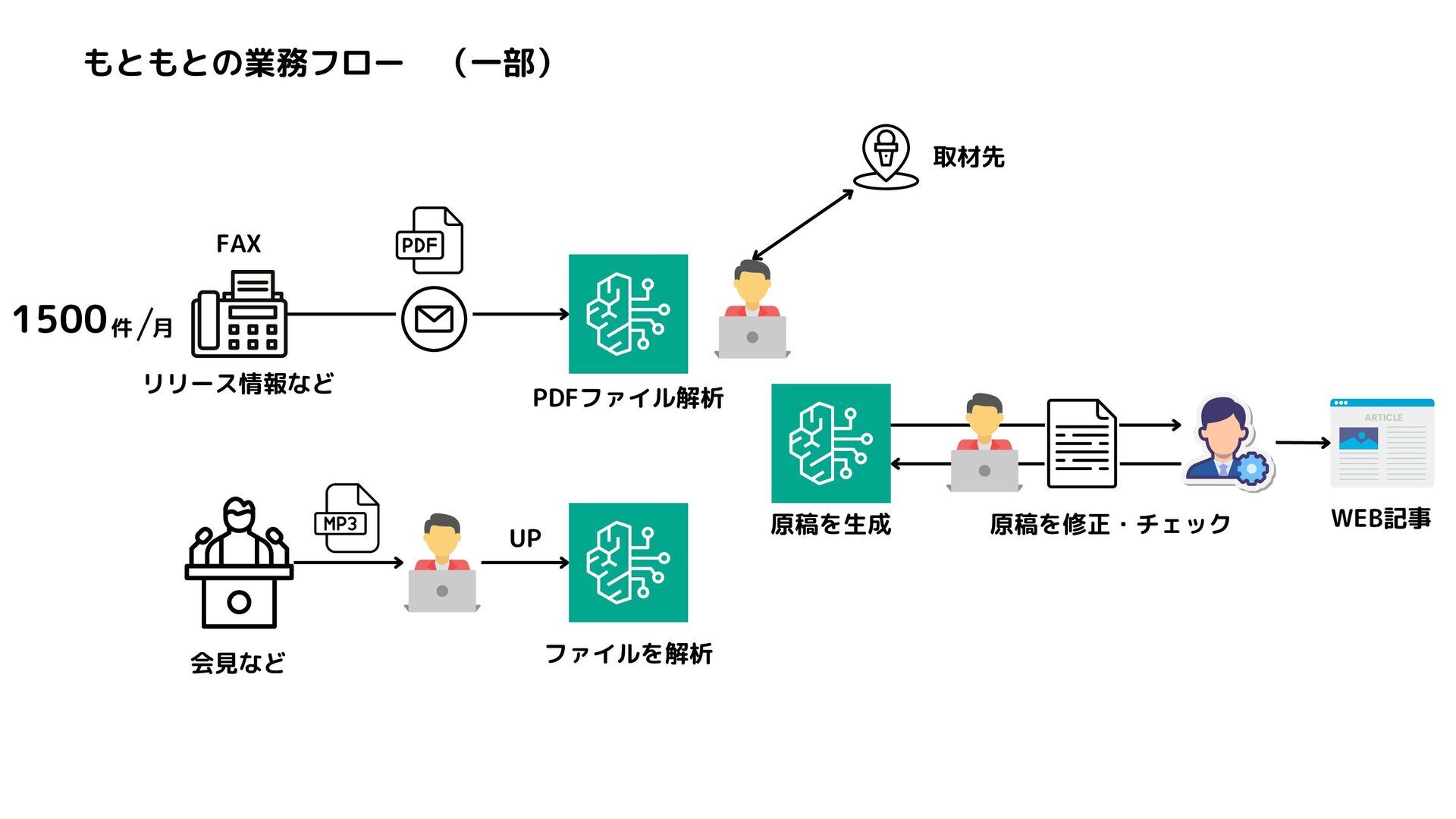 会見など リリース情報など FAX もともとの業務フロー (一部) PDFファイル解析 ファイルを解析 原稿を生成 WEB記事 原稿を修正・チェック UP