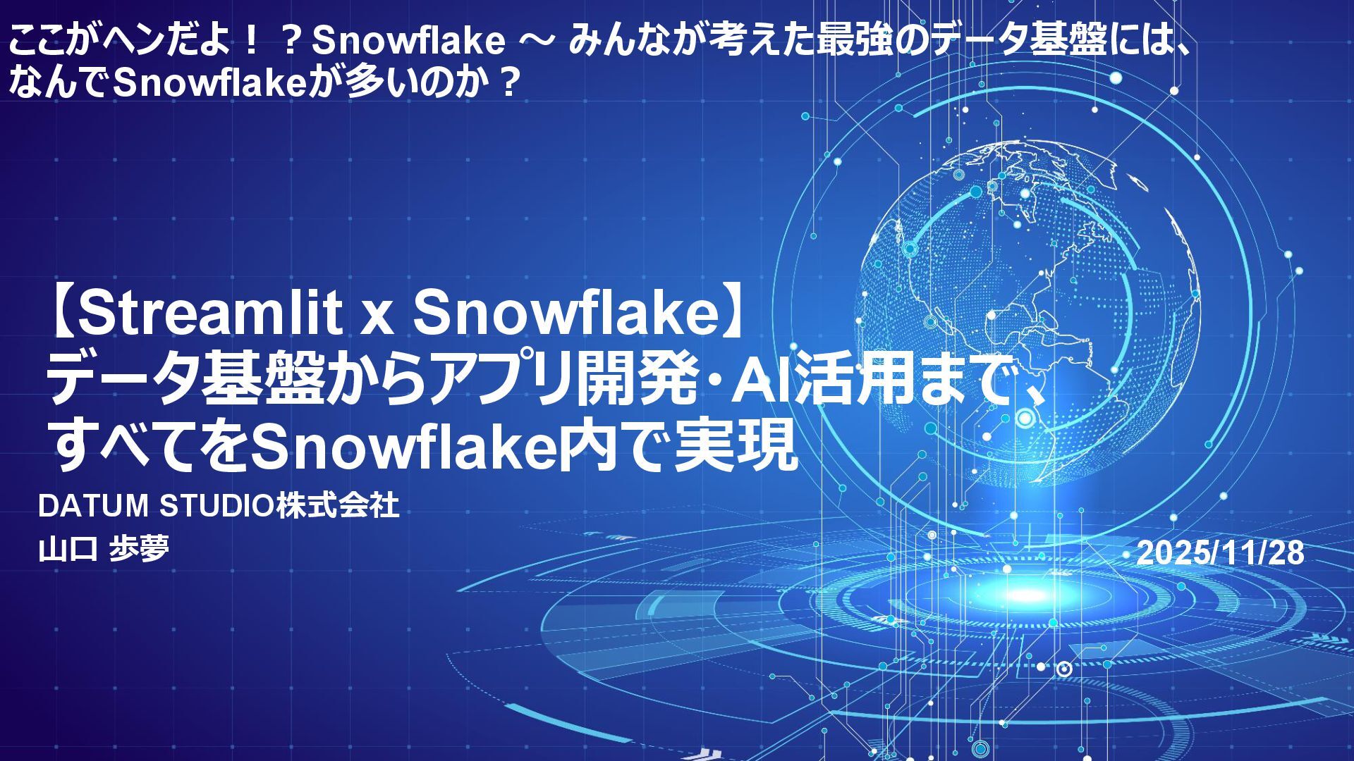 【Streamlit x Snowflake】 データ基盤からアプリ開発・AI活用まで、 すべてをSnowflake内で実現 2025/11/28 ここがヘンだよ!?Snowflake 〜 みんなが考えた最強のデータ基盤には、 なんでSnowflakeが多いのか?