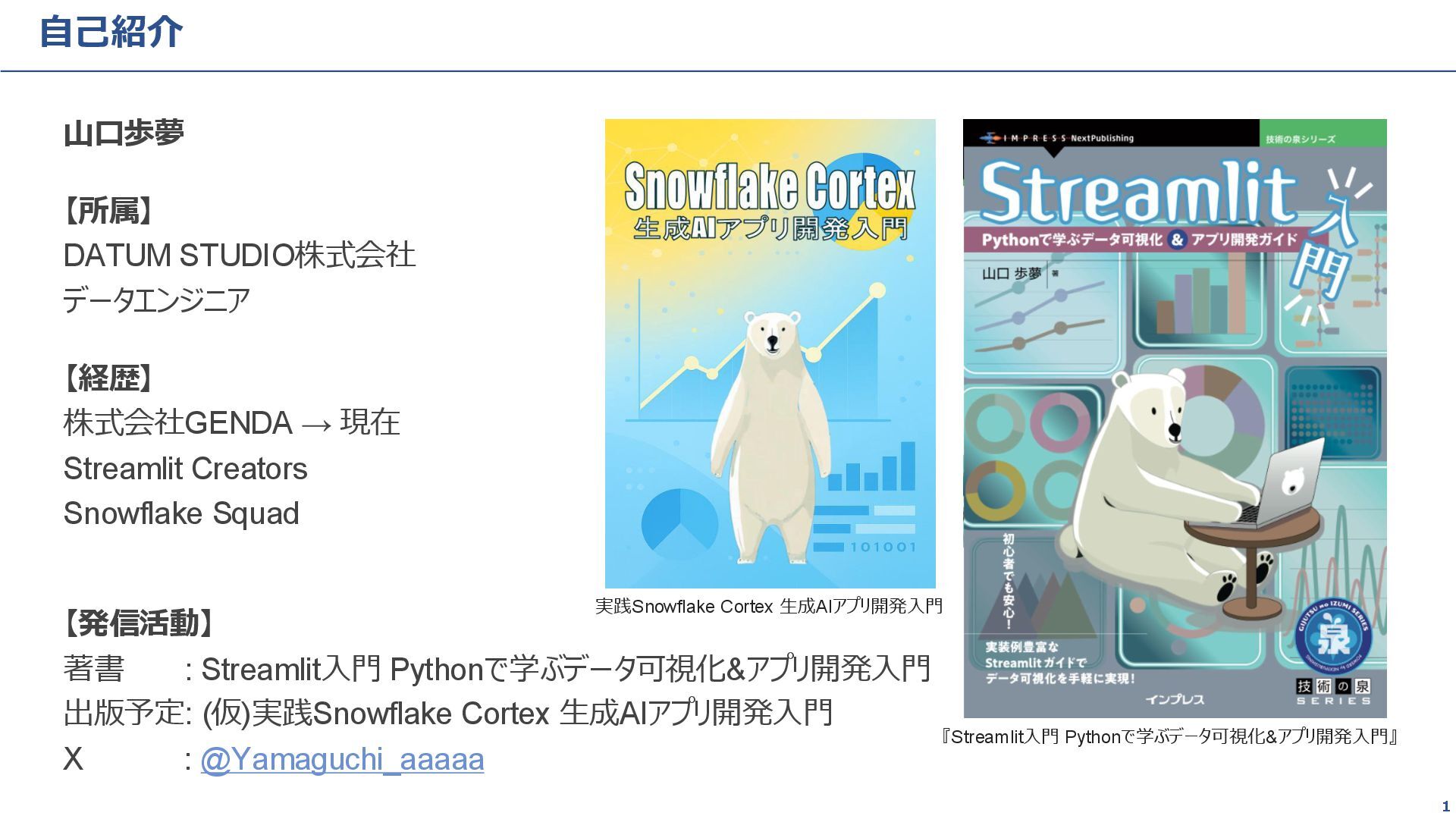 → 現在 Streamlit Creators Snowflake Squad 【発信活動】 著書 : Streamlit入門 Pythonで学ぶデータ可視化&アプリ開発入門 出版予定: (仮)実践Snowflake Cortex 生成AIアプリ開発入門 X : @Yamaguchi_aaaaa 『Streamlit入門 Pythonで学ぶデータ可視化&アプリ開発入門』 実践Snowflake Cortex 生成AIアプリ開発入門