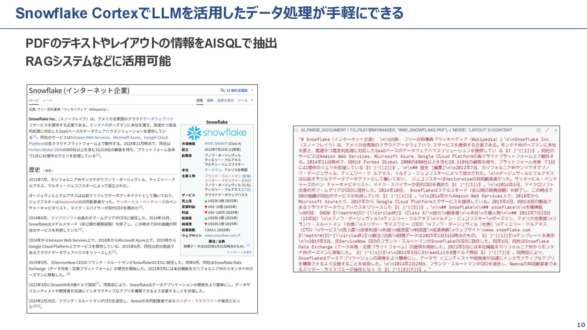 10 10 Snowflake CortexでLLMを活用したデータ処理が手軽にできる PDFのテキストやレイアウトの情報をAISQLで抽出 RAGシステムなどに活用可能