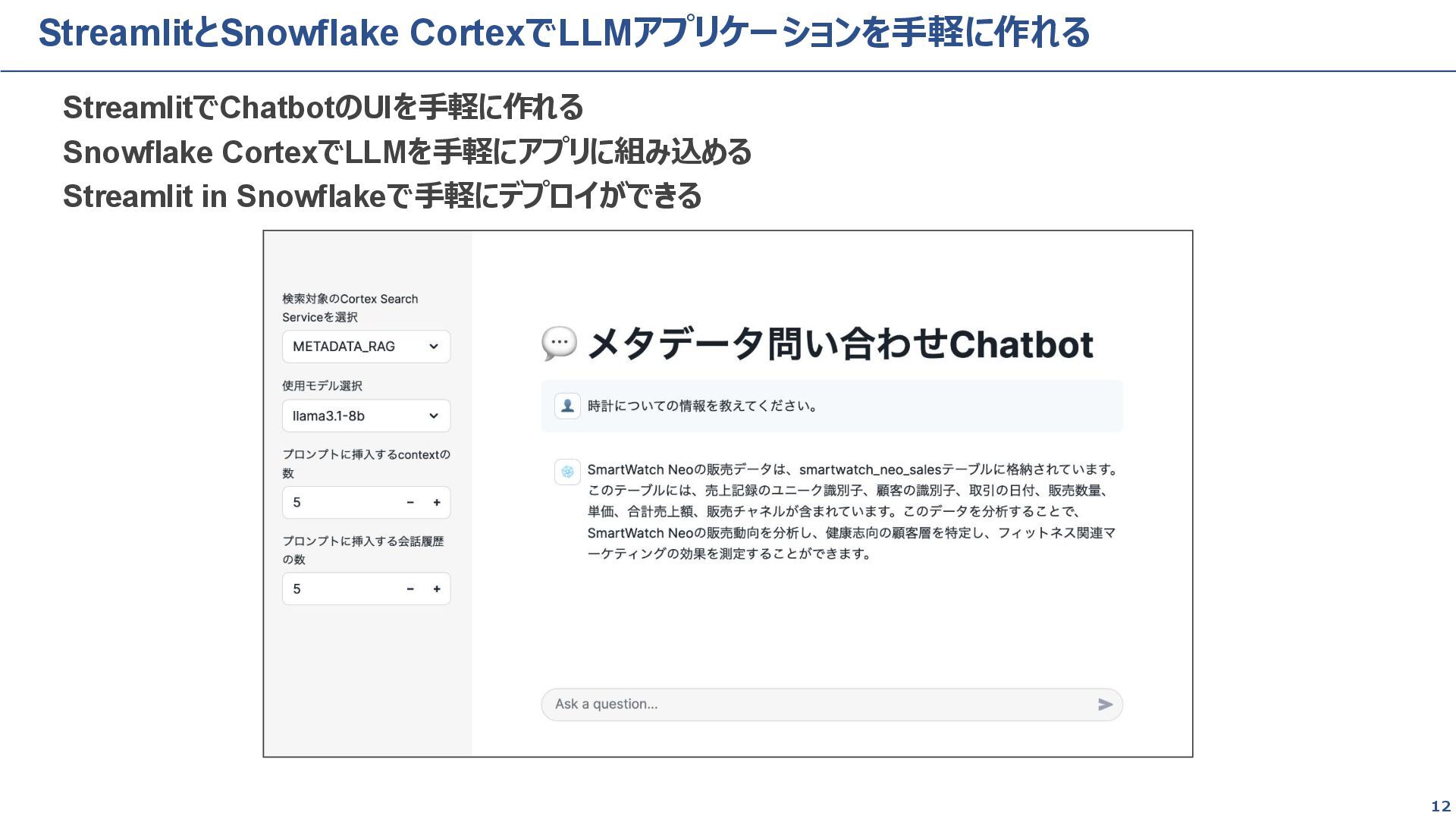 12 12 StreamlitとSnowflake CortexでLLMアプリケーションを手軽に作れる StreamlitでChatbotのUIを手軽に作れる Snowflake CortexでLLMを手軽にアプリに組み込める Streamlit in Snowflakeで手軽にデプロイができる
