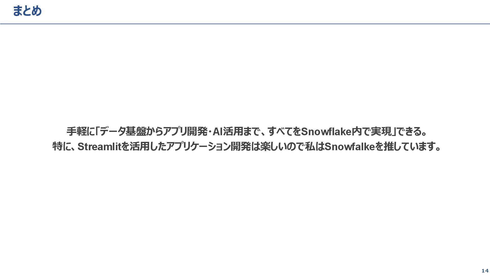 14 14 まとめ 手軽に「データ基盤からアプリ開発・AI活用まで、すべてをSnowflake内で実現」できる。 特に、Streamlitを活用したアプリケーション開発は楽しいので私はSnowfalkeを推しています。