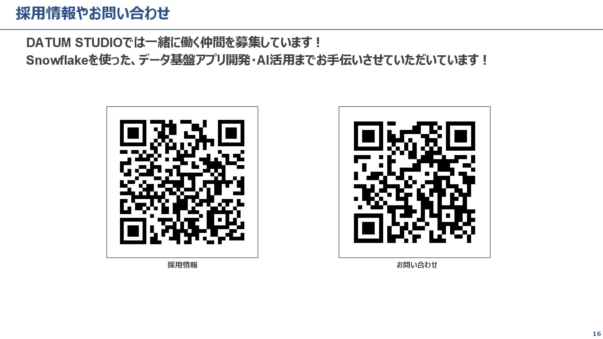 16 16 採用情報やお問い合わせ DATUM STUDIOでは一緒に働く仲間を募集しています! Snowflakeを使った、データ基盤アプリ開発・AI活用までお手伝いさせていただいています! 採用情報 お問い合わせ
