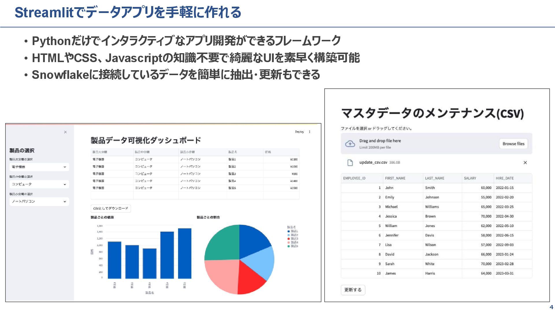 4 4 Streamlitでデータアプリを手軽に作れる • Pythonだけでインタラクティブなアプリ開発ができるフレームワーク • HTMLやCSS、Javascriptの知識不要で綺麗なUIを素早く構築可能 • Snowflakeに接続しているデータを簡単に抽出・更新もできる