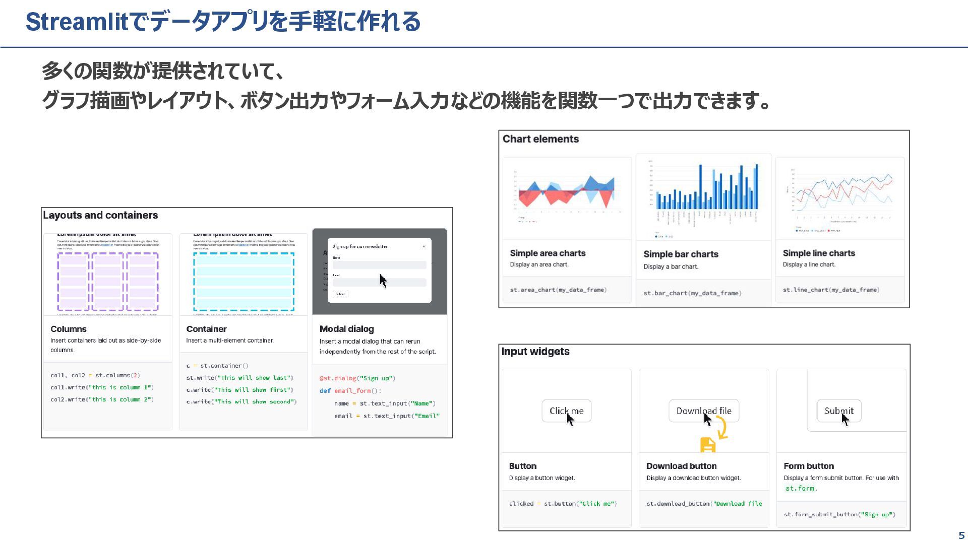 5 5 Streamlitでデータアプリを手軽に作れる 多くの関数が提供されていて、 グラフ描画やレイアウト、ボタン出力やフォーム入力などの機能を関数一つで出力できます。