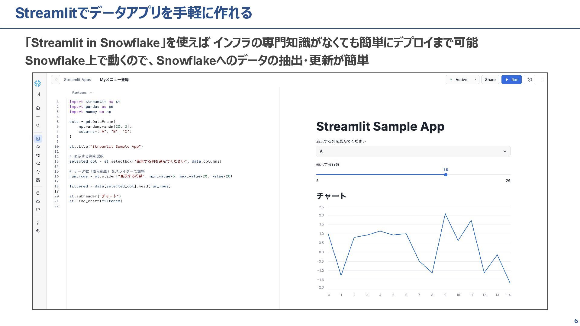 6 6 Streamlitでデータアプリを手軽に作れる 「Streamlit in Snowflake」を使えば インフラの専門知識がなくても簡単にデプロイまで可能 Snowflake上で動くので、Snowflakeへのデータの抽出・更新が簡単