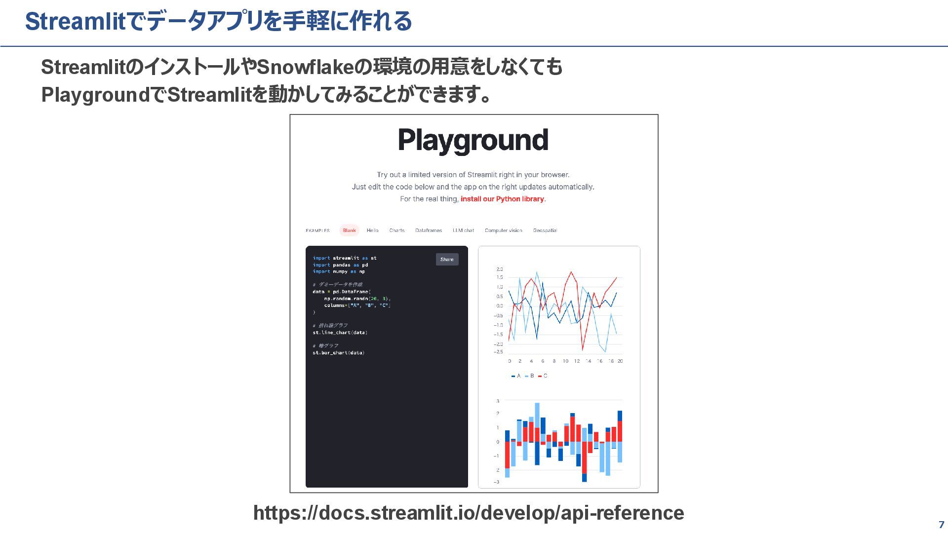 7 7 Streamlitでデータアプリを手軽に作れる StreamlitのインストールやSnowflakeの環境の用意をしなくても PlaygroundでStreamlitを動かしてみることができます。 https://docs.streamlit.io/develop/api-reference