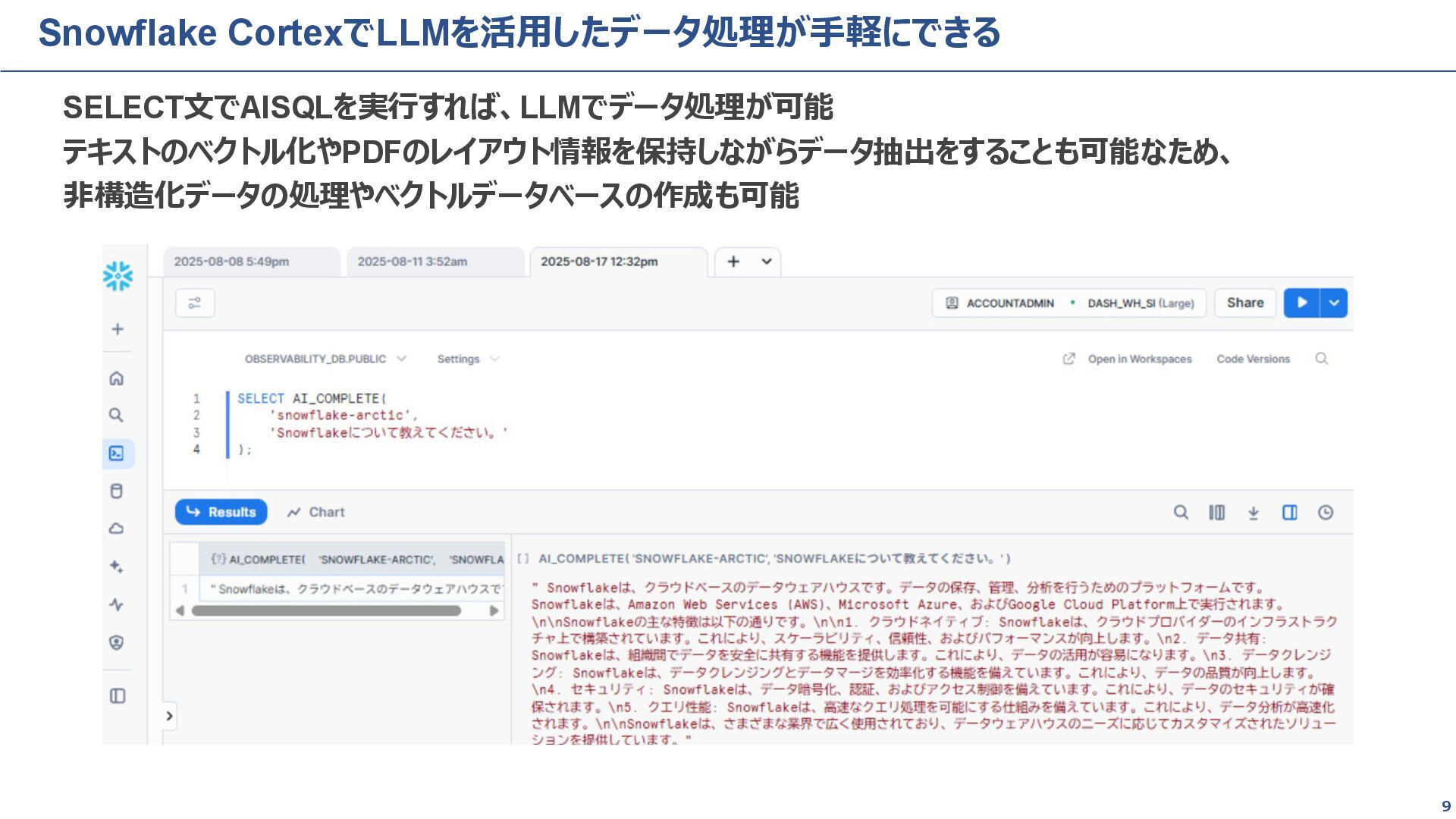 9 9 Snowflake CortexでLLMを活用したデータ処理が手軽にできる SELECT文でAISQLを実行すれば、LLMでデータ処理が可能 テキストのベクトル化やPDFのレイアウト情報を保持しながらデータ抽出をすることも可能なため、 非構造化データの処理やベクトルデータベースの作成も可能
