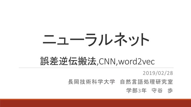 ニューラルネット 2019/02/28 長岡技術科学大学 自然言語処理研究室 学部3年 守谷 歩 誤差逆伝搬法,CNN,word2vec