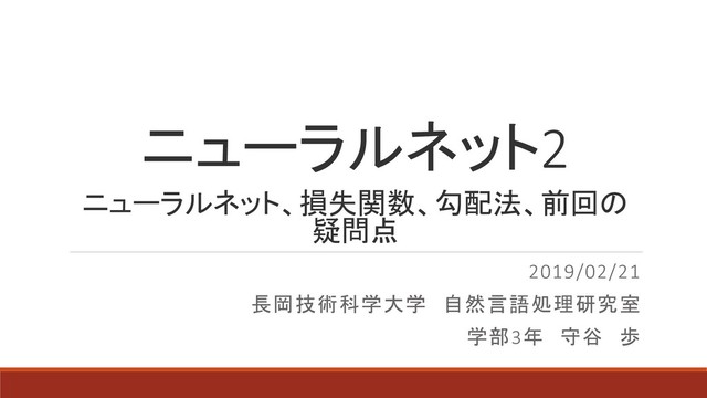 ニューラルネット2 2019/02/21 長岡技術科学大学 自然言語処理研究室 学部3年 守谷 歩 ニューラルネット、損失関数、勾配法、前回の 疑問点