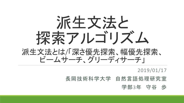 派生文法と 探索アルゴリズム 2019/01/17 長岡技術科学大学 自然言語処理研究室 学部3年 守谷 歩 派生文法とは/「深さ優先探索、幅優先探索、 ビームサーチ、グリーディサーチ」