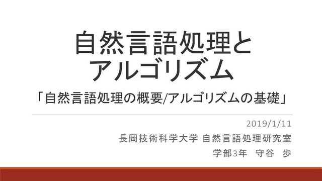 自然言語処理と アルゴリズム 2019/1/11 長岡技術科学大学 自然言語処理研究室 学部3年 守谷 歩 「自然言語処理の概要/アルゴリズムの基礎」