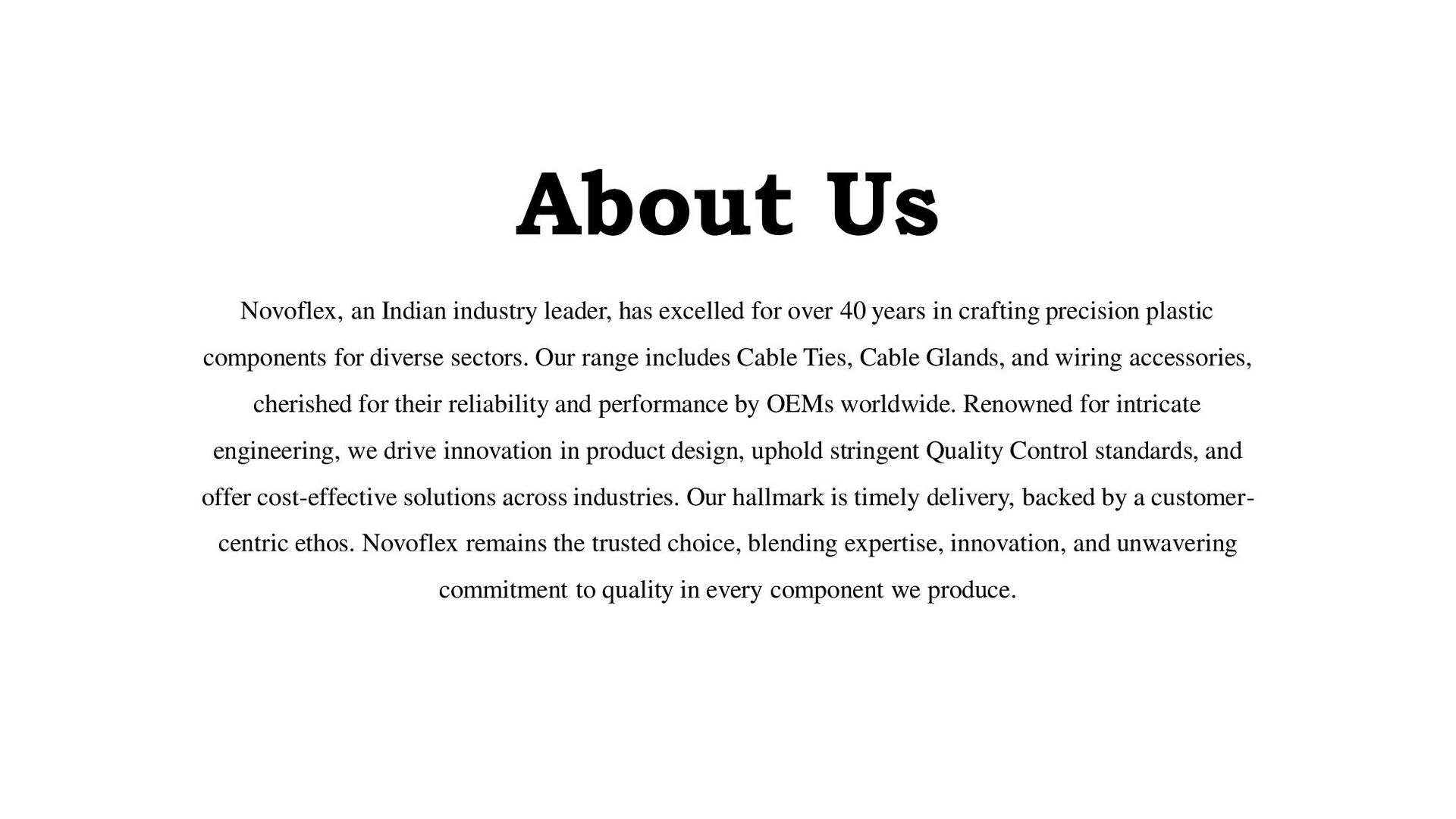 Novoflex excels in crafting high-quality Cable Ties, Cable Glands, and wiring accessories, known for precision and durability. Our commitment to innovation, stringent quality standards, and on-time delivery make us the go-to choice for OEMs globally.