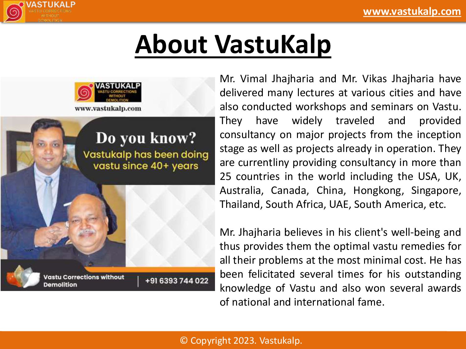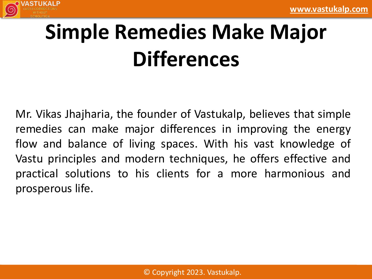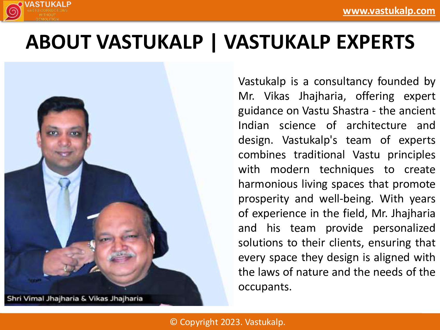 Vastukalp is a leading Vastu consultant firm founded by Mr. Vikas Jhajharia, offering personalized solutions that blend ancient Vastu principles with modern techniques. Specializing in Vastu correction without demolition, Vastukalp ensures that each space promotes harmony and prosperity.