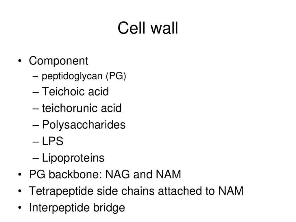 structures – virulence factors – Fully permeable to ions, aminoacids and sugars – makes it rigid – determines shape – Acts as antigen – Used as serological diagnosis