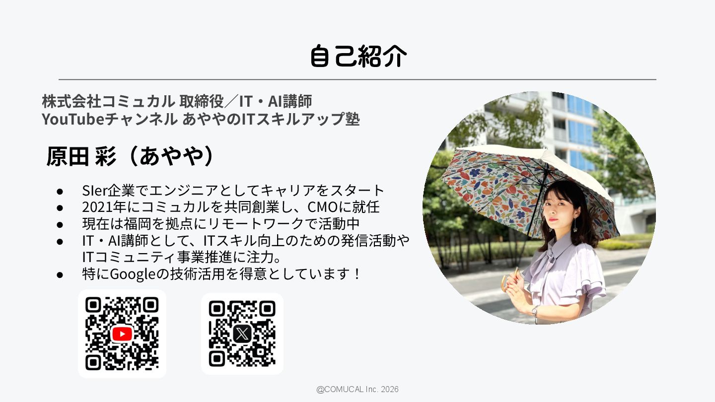 • IT‧AI講師として、ITスキル向上のための発信活動や ITコミュニティ事業推進に注⼒。 • 特にGoogleの技術活⽤を得意としています! 株式会社コミュカル 取締役∕IT‧AI講師 YouTubeチャンネル あややのITスキルアップ塾 原⽥ 彩(あやや)